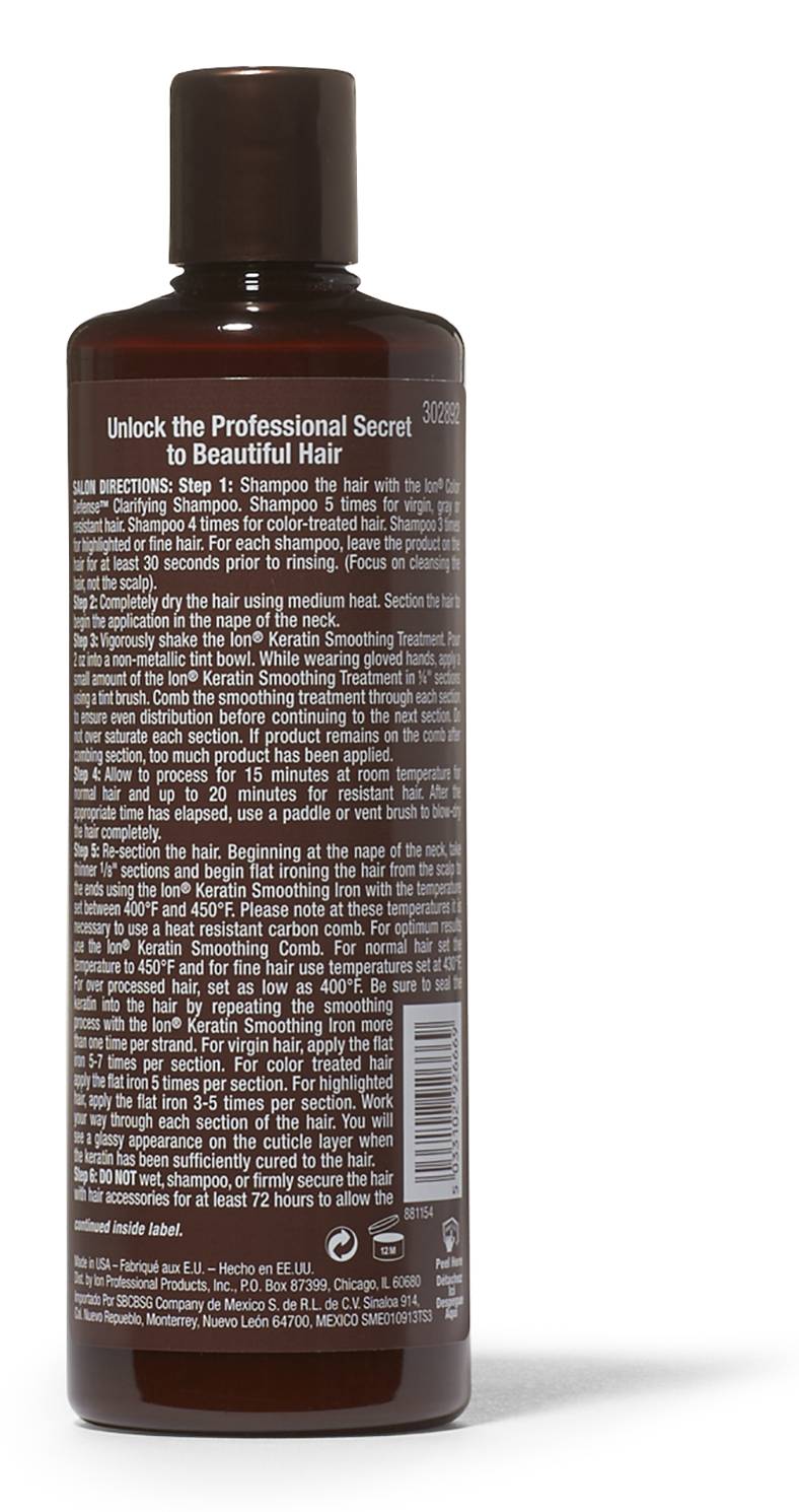 Step 1: Shampoo the hair with the Ion Keratin Clarifying Shampoo. Shampoo 5 times for virgin, gray or resistant hair. Shampoo 4 t imes for color treated hair. Shampoo 3 times for highlighted or fine hair. For each shampoo, leave the product on the hair for at least 30 seconds prior to rinsing. (Focus on cleansing the hair, not the scalp). Step 2: Completely dry the hair using medium heat. Section the hair to begin the application in the nape of the neck. Step 3: Vigorously shake the Ion® Keratin Smoothing Treatment. Pour 2 oz into a non-metallic tint bowl. While wearing gloves, apply a small amount of the Ion Keratin Smoothing Treatment in 1/4" sections using the enclosed tint brush. Using the comb on the opposite side, comb the smoothing treatment through each section to ensure even distribution before continuing to the next section. Do not over saturate each section. If product remains on the comb after combing section, too much product has been applied. Step 4: Allow to process for 15 minutes at room temperature for normal hair and up to 20 minutes for resistant hair. After the appropriate time has elapsed, use a paddle or vent brush to blow-dry the hair completely. Step 5: Re-section the hair. Beginning at the nape of the neck, take thinner 1/8"sections and begin flat ironing the hair from the scalp to the ends using the Ion Keratin Smoothing Iron with the temperature set between 400°F and 450°F. Please note at these temperatures it is necessary to use a heat resistant carbon comb. For optimum results use the Ion Keratin Smoothing Comb. For normal hair set the temperature to 450°F. and for fine hair use temperatures set at 430°F. For over processed hair, set as low as 400°F. Be sure to seal the keratin into the hair by repeating the smoothing process with the Ion Keratin Smoothing Iron more than one time per strand. For virgin hair, apply the flat iron 5-7 times per section. For color treated hair apply the flat iron 5 times per section. For highlighted hair, apply the flat iron 3-5 times per section. Work your way through each section of the hair. You will see a glassy appearance on the cuticle layer when the keratin has been sufficiently cured to the hair. Step 6: DO NOT wet, shampoo, or firmly secure the hair with hair accessories for at least 72 hours to allow the hair to be transformed into the desired smooth straight results. If the hair becomes damp during this period, dry and smooth with the Ion Keratin Smoothing Iron at temperature specific to hair type. Step 7: It is important to maintain the hair with the Ion Keratin Smoothing maintenance products following the treatment. Shampoos, conditioners, and styling products containing sodium chloride will remove the keratin coating from the hair. Note: Color services up to 20 volume hydrogen peroxide can be applied same day. Shampoo 3-5 times according to the above directions. Dry the hair 50-100% then proceed with color application. Rinse thoroughly without shampooing or conditioning. Dry the hair completely then continue with the Keratin Smoothing Treatment. If the hair has already been treated with the Keratin Smoothing Treatment, wait 7-10 days before applying hair color. When used with sodium hydroxide relaxers or thermal straighteners it is critical they are applied at least 4 weeks apart.