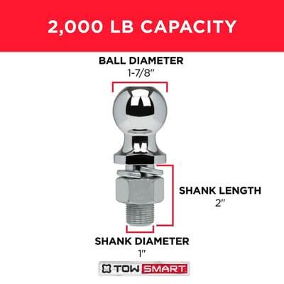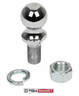 Equipped with a threaded shank, the TowSmart Class III Hitch Ball is crafted from solid steel and boasts a chrome finish. It comes complete with a locking washer and mounting nut, and features wrench flats to facilitate easy installation.