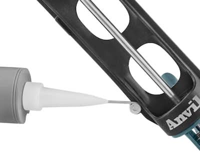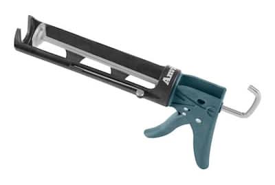 Anvil 10 oz. drip free ratchet caulk gun is a lightweight caulk gun with rotating barrel for easy applications around edges and corners. It offers an 8:1 thrust ratio making it ideal for 10 oz. tubes of acrylic/latex and silicone caulk. The ratchet rod helps deliver consistent flow during application and is suitable for light to medium duty projects. Features include a drip free tip that helps prevent waste, a built-in spout cutter to safely snip the tip off a caulk tube, seal punch to break the inner seal of a caulk tube and ladder hook.
