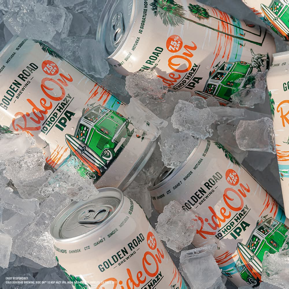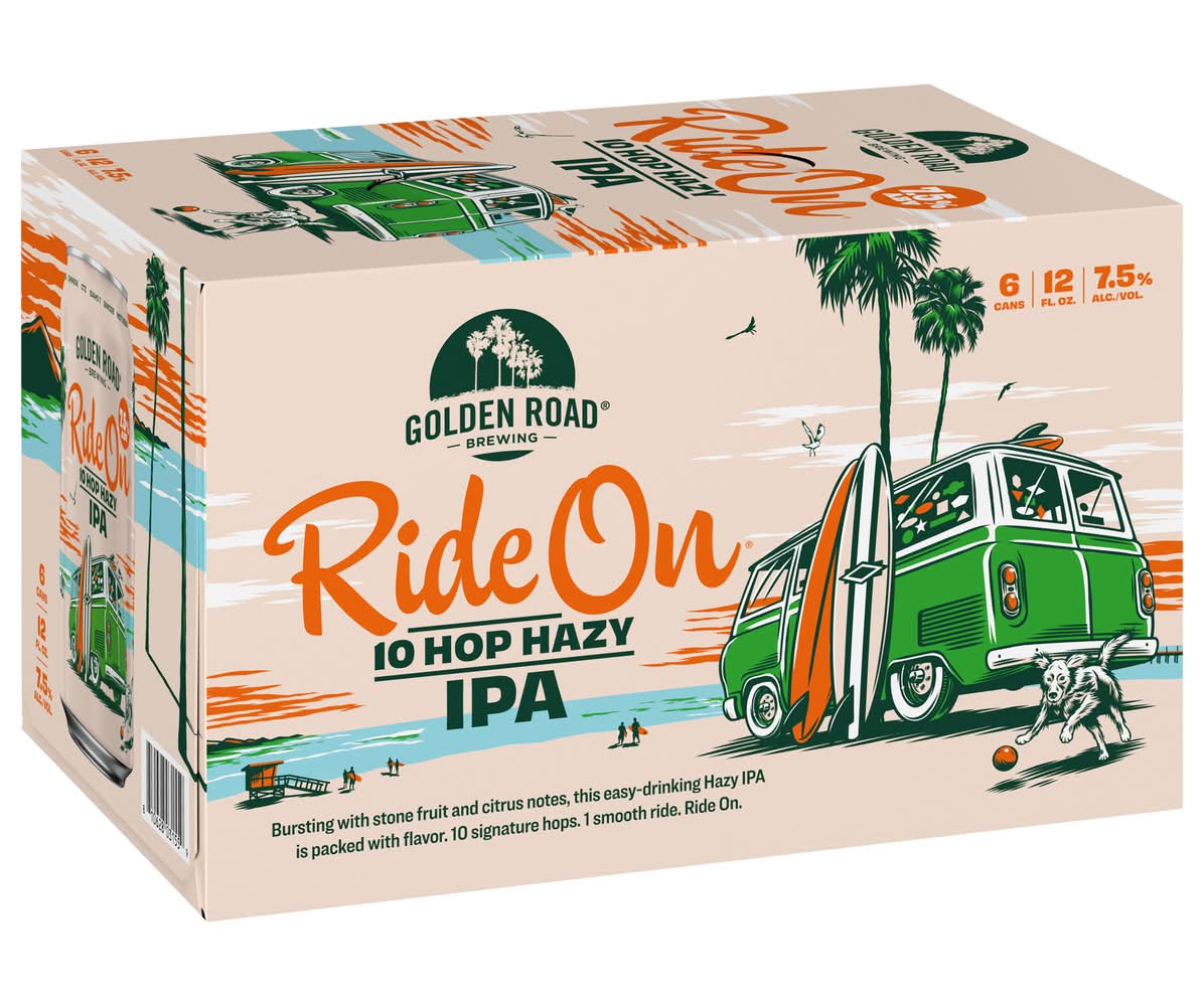 The first release of the Ride On IPA Family. Brewed with hops selected from as far away as Australia and New Zealand. Smooth, big, juicy, and full of flavor. Hoppy, hazy, refreshing, and delicious IPA with complex aromas and flavors of citrus. • Alcohol by volume: 7.5% • Golden Road Brewing, • Packaging: Reusable