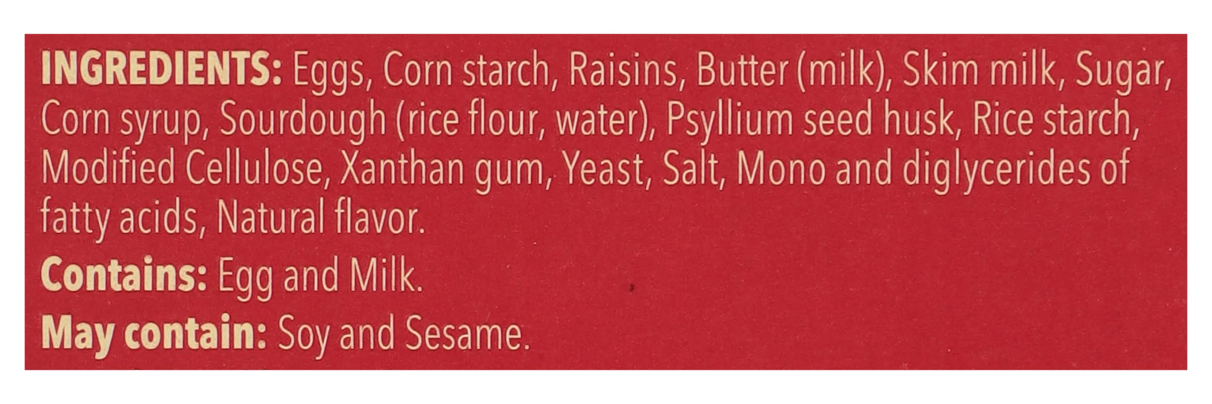 Eggs, Corn Starch, Raisins, Butter (Milk), Skim Milk, Sugar, Corn Syrup, Sourdough (Rice Flour, Water), Psyllium Seed Husk, Rice Starch, Modified Cellulose, Xanthan Gum, Yeast, Salt, Mono and Diglycerides of Fatty Acids, Natural Flavor Contains: Eggs, Milk, Soybeans, Sesame