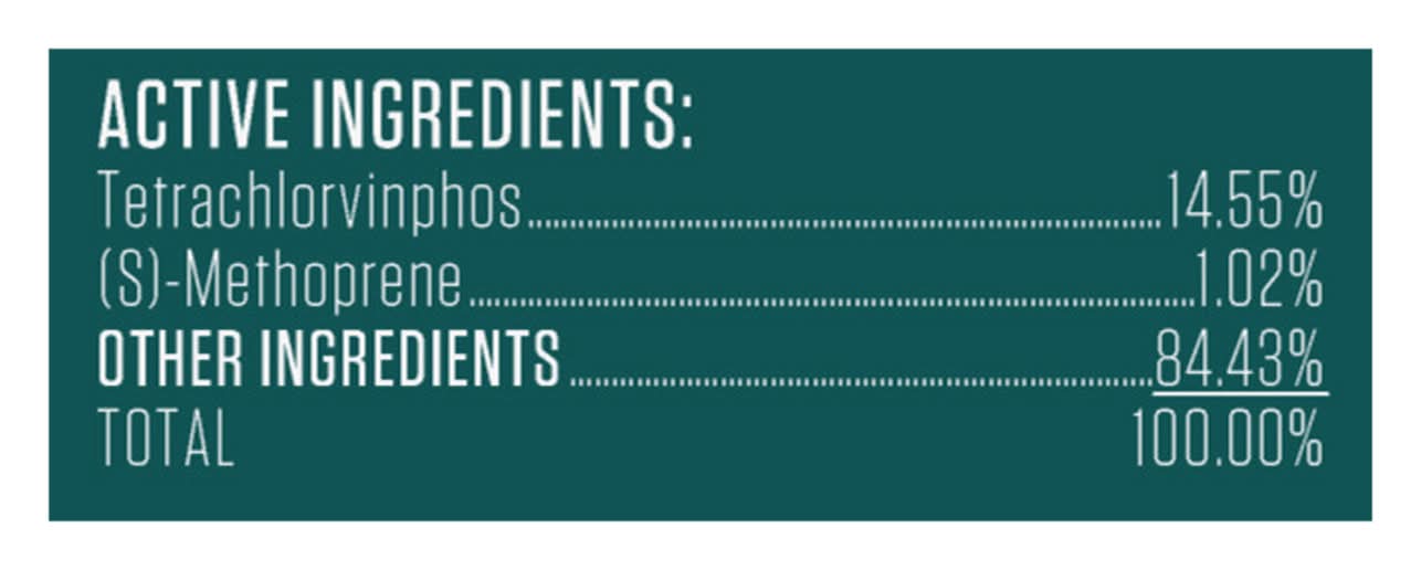 Active Ingredients: Tetrachlorvinphos – 14.55%; (S)-Methoprene – 1.02%, Other Ingredients: – 84.43%, Total – 100.00%