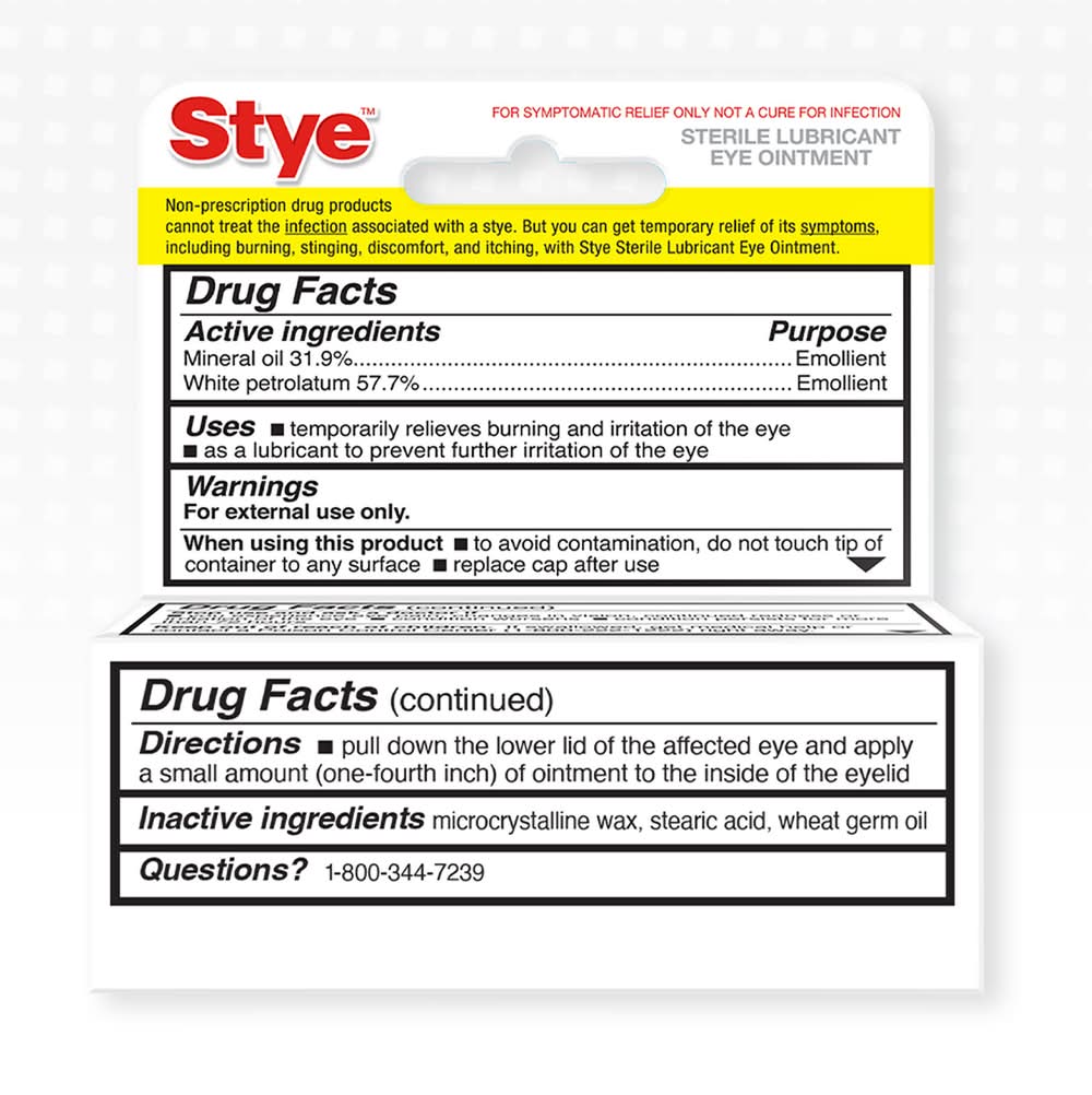Stye Eye Ointment is the number one brand in stye symptom relief* and is clinically proven to provide symptomatic relief from styes. Stye Eye Ointment temporarily relieves symptoms associated with styes, including burning, itching, and stinging. Stye ointment is sterile and ophthalmologist-tested and provides lubrication to prevent further irritation to the eye. A stye occurs when bacteria get trapped in the oil gland along the lashline or under the eyelid. Only prescription products can treat infection, but Stye can help provide temporary relief from the pain and discomfort associated with the stye. Use Stye products to cleanse, relieve, and soothe irritated eyes: Stye Eye Ointment at night, Stye Eye Drops during the day, Stye Warming Eye Compress as needed, and Stye Wipes on the go. While other brands may rely on homeopathic methods, Stye Eye Ointment is a clinically proven nonprescription eye ointment for symptom relief when you need it. If your symptoms persist or worsen after several days of at home treatment, consult your healthcare provider. FSA-eligible and HSA-eligible product in the USA. For adult use daily as needed. * IRI Data L52W MULO + C 9/16/24 Insight Pharmaceuticals Corp., Langhorne,PA,19047-1749