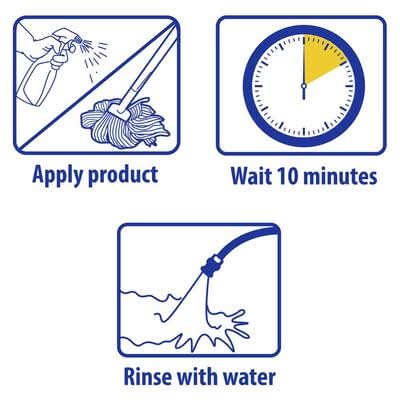 Cleaner may dissolve protective coatings and sealers and may require refinishing. test product for surface compatibility in an inconspicuous area, rinse and allow to dry before proceeding. saturate plants, shrubs and grass adjacent to cleaning area with water before, during and after cleaning 1. dilute product according to the dilution ratios listed below. 2. apply with a mop, pressure washer or pump sprayer. scrub using a floor machine or deck brush on concrete floors. 3. to prevent damage, allow contact time of no more than 10 minutes and do not allow to dry before rinsing. 4. rinse thoroughly with water, using a mop and wringer or pressure washer. some soils may penetrate concrete and become permanent stains. dilution ratios: light soils: mix 6 oz. cleaner with 1 gallon of hot water for use on concrete, masonry and asphalt medium soils: mix 12 oz. cleaner with 1 gallon of hot water for use on greasy concrete, masonry and asphalt. heavy soils: mix 26 oz. cleaner with 1 gallon of hot water for use on greasy concrete and masonry, or increase up to 50/50 for difficult stains. note: avoid contact with painted and stained surfaces, aluminum, brass, chrome, copper and other alkaline sensitive surfaces, as damage may occur. test product for surface compatibility in an inconspicuous area, rinse and allow lo dry before proceeding. cleaner may dissolve protective coatings and sealers and may require refinishing. saturate plants, shrubs and grass adjacent to cleaning area with water before, during and after cleaning.