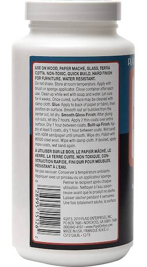 This all-in-one decoupage glue, sealer and finish is quick-drying for multiple coat build up. Gloss finish. Nontoxic. Water resistant. Water based.