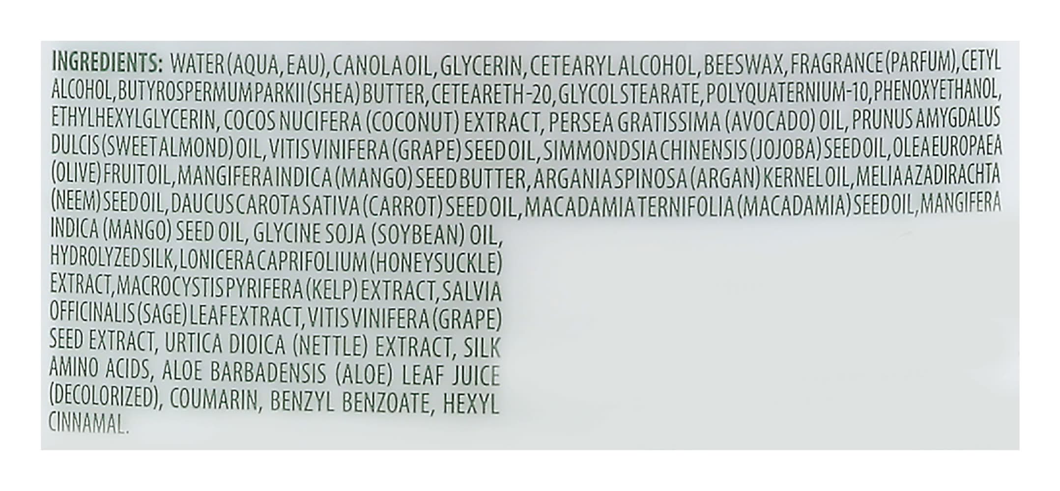 Ingredients: Water(Aqua, Eau), Canola Oil, Glycerin, Cetearyl Alcohol, Beeswax, Fragrance(Parfum), Cetyl Alcohol, Butyrospermumparkii (Shea) Butter, Ceteareth -20, Glycolstearate, Polyquaternium-10, Phenoxyethanol, Ethylhexylglycerin, Cocos Nucifera (Coconut) Extract, Persea Gratissima (Avocado, ) Oil, Prunus Amygdalus Dulcis (Sweet Almond) Oil, Vitisvinifera (Grape) Seedoil, Simmondsia Chinensis (Jojoba) Seed Oil, Oleaeuropaea (Olive) Fruit Oil, Mangiferaindica (Mango) Seed Butter, Arganiaspinosa (Argan) Kernel Oil, Melia Azadirachta (Neem) Seed Oil, Daucus Carota Sativa (Carrot) Seed Oil, Macadamia Ternifolia (Macadamia) Seed Oil Mangifera Indica (Mango) Seed Oil, Glycine Soja (Soybean) Oil, Hydrolyzed Silk, Lonicera Caprifolium (Honeysuckle) Extract, Macrocystispyrifera (Kelp) Extract, Salvia Officinalis (Sage) Leaf Extract, Vitisvinifera (Grape) Seed Extract, Urtica Dioica (Nettle) Extract, Silk Amino Acids, Aloe Barbadensis (Aloe) Leaf Juice (Decolorized), Coumarin, Benzyl Benzoate, Hexyl Cinnamal. Contains: Tree Nuts