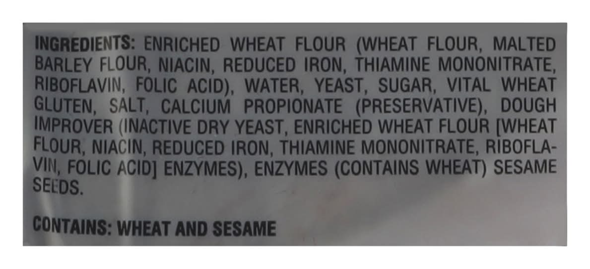 Enriched Wheat Flour (Wheat Flour, Malted Barley Flour, Niacin, Reduced Iron, Thiamine Mononitrate, Riboflavin, Folic Acid), Water, Yeast, Sugar, Vital Wheat Gluten, Salt, Calcium Propionate (Preservative), Dough Improver (Inactive Dry Yeast, Enriched Wheat Flour [Wheat Flour, Niacin, Reduced Iron, Thiamine Mononitrate, Riboflavin, Folic Acid] Enzymes), Enzymes (Contains Wheat) Sesame Seeds Contains: Wheat, Barley, Gluten, Sesame