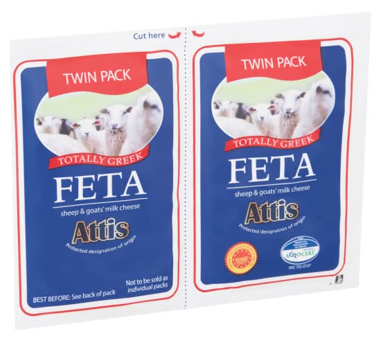 Attis Feta is a cheese made from a blend of sheep and goat's milk, traditionally crafted in Greece. It is available in a convenient twin pack. John & Pascalis Ltd,
