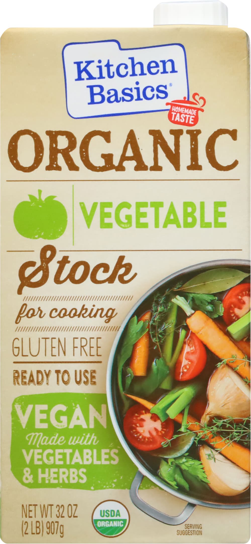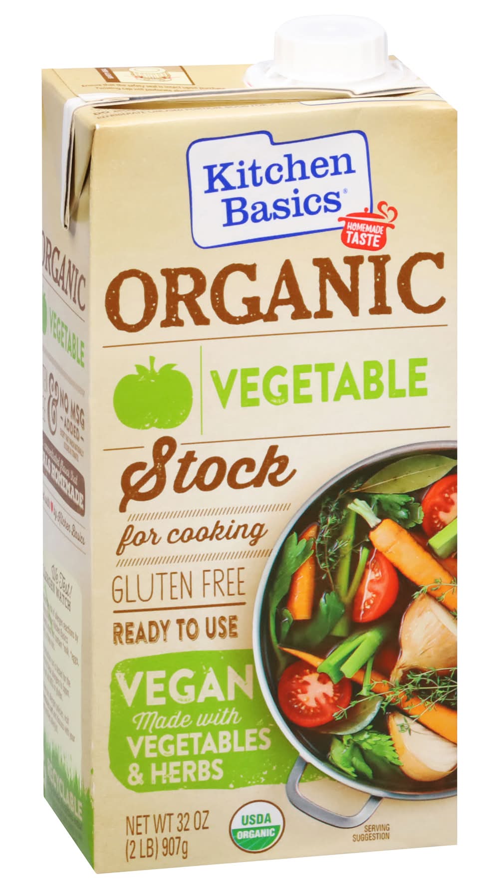 Elevate your homemade dishes with Kitchen Basics Organic Vegetable Stock. Crafted with the highest quality organic ingredients, this stock is the must-have for all your vegan cooking needs. Slow-simmered for hours, our vegetable stock boasts robust flavors of fresh veggies, premium herbs, and spices. As a USDA certified organic product, our stock is the ultimate foundation for creating delicious and healthy meals. From hearty vegetable soup to savory noodle dishes, the possibilities are endless with this versatile stock. Add a splash to your broth, sauces, or side dishes to enhance their taste and elevate your cooking. With its larger and convenient carton packaging, stock up for all the meals you have coming up. Get creative in the kitchen with the help of Kitchen Basics Organic Vegetable Stock. • Number of servings: 4 • McCormick & Co., Inc., Hunt Valley, MD, 21031-1100, Ph: 800-632-5847 • Packaging: Reusable