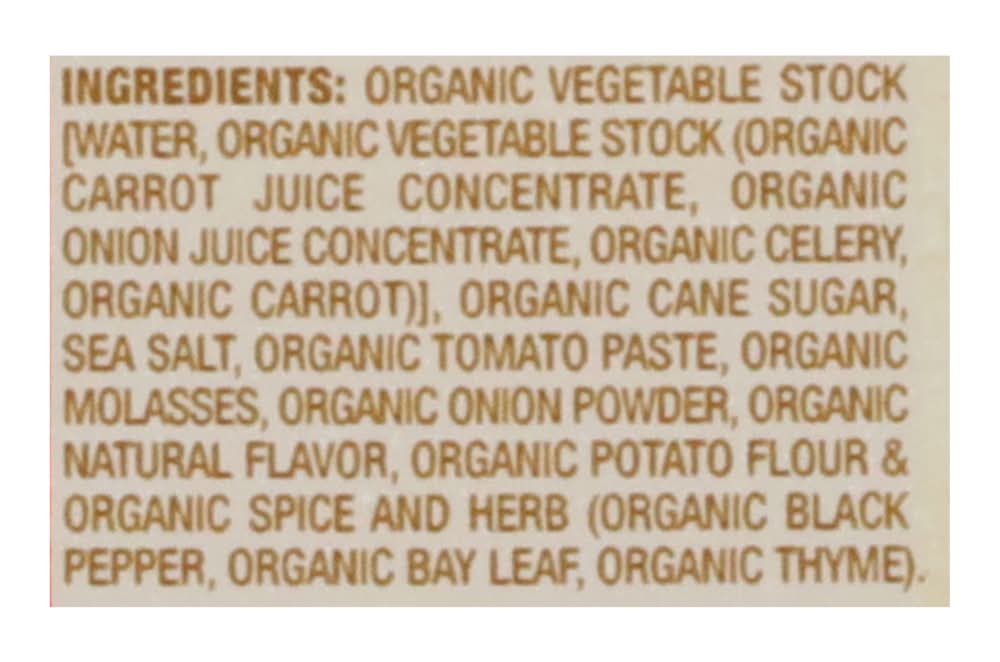 Ingredients: Organic Vegetable Stock [Water, Organic Vegetable Stock (Organic Carrot Juice Concentrate, Organic Onion Juice Concentrate, Organic Celery, Organic Carrot)], Organic Cane Sugar, Sea Salt, Organic Tomato Paste, Organic Molasses, Organic Onion Powder, Organic Natural Flavor, Organic Potato Flour & Organic Spice and Herb (Organic Black Pepper, Organic Bay Leaf, Organic Thyme) Contains: Celery