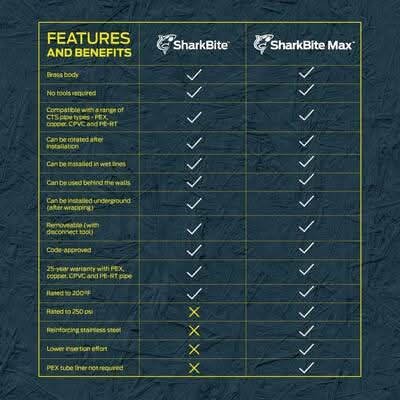 SharkBite Max push-to-connect ball valves are the fastest and easiest way to install a new or replacement water shut-off valve. A newly designed stainless steel collet retainer delivers additional strength and durability and provides a 250 psi pressure rating. SharkBite Max fittings and valves don't require a PEX tube liner and a re-engineered body allows you to insert the pipe using less force and greater ease. The single lever quarter turn handle allows for quick control over water flow, especially in tight spaces. No soldering, clamps, unions, glue, or special tools required. After inserting the pipe, stainless steel teeth bite down and grip the pipe tightly while a specially formulated O-ring compresses around the pipe to create a watertight seal. The valve can be rotated after installation for quick adjustments, and removing the valve is just as fast with a disconnect tool, allowing them to be changed or reused. WARNING: This product can expose you to chemicals known to the State of California to cause cancer and birth defects or other reproductive harm. For more information, go to www.P65Warnings.ca.gov Size: 1/2 in