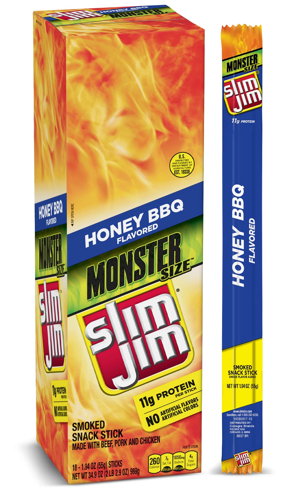 Shhh… Do you hear that terrifying gurgle? It sounds like it… it’s coming from your belly. Just when you thought nothing would ever satisfy your nightmarish appetite, here comes Slim Jim Honey BBQ Flavor Monster Sized Meat Stick. Made to please your inner Jekyll when your Mr. Hyde gets a little too hangry, each beefy serving of these Slim Jim Snack Meat Stick tames that rage with 11 grams of protein. Individually wrapped snack stick with a bold taste of epic proportions. Whether you’re hunting down the elusive Sasquatch, scaling the side of the Empire State Building, lurking around a dark lagoon, morphing your body into a human-sized housefly, or taking an anthropological field trip into the old tombs of a haunted mummy queen, these handy on-the-go barbecue flavor snacks can go with you anytime, anywhere. Feed your inner demons with Slim Jim, the monster-sized snack that bites back. • Conagra Brands, • Packaging: Reusable
