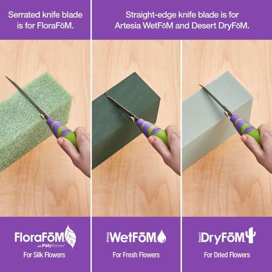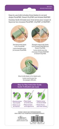 Buy the Flora Craft Easy Prō Floral Tools Floral FōM Knife & Blade Set at Michaels. The Flora Craft Floral FōM knife is used to easily cut any floral foam type into custom shapes to fit any container or application. The cutter comes with three blades: a serrated blade for cutting Flora FōM, a straight-edge blade for cutting Artesia Wet FōM and Desert Dry FōM and a shorter curved blade for detail work. Green and purple. 4 pieces . Blades can be stored inside handle. Designed to cut all floral foam types into custom shapes to fit any container or application. Handle features an ergonomic design with rubber grip. Rust-resistant, heavy-duty steel blades . FloraCraft Easy Prō Floral Tools Floral FōM Knife & Blade Set Size: 1 CT