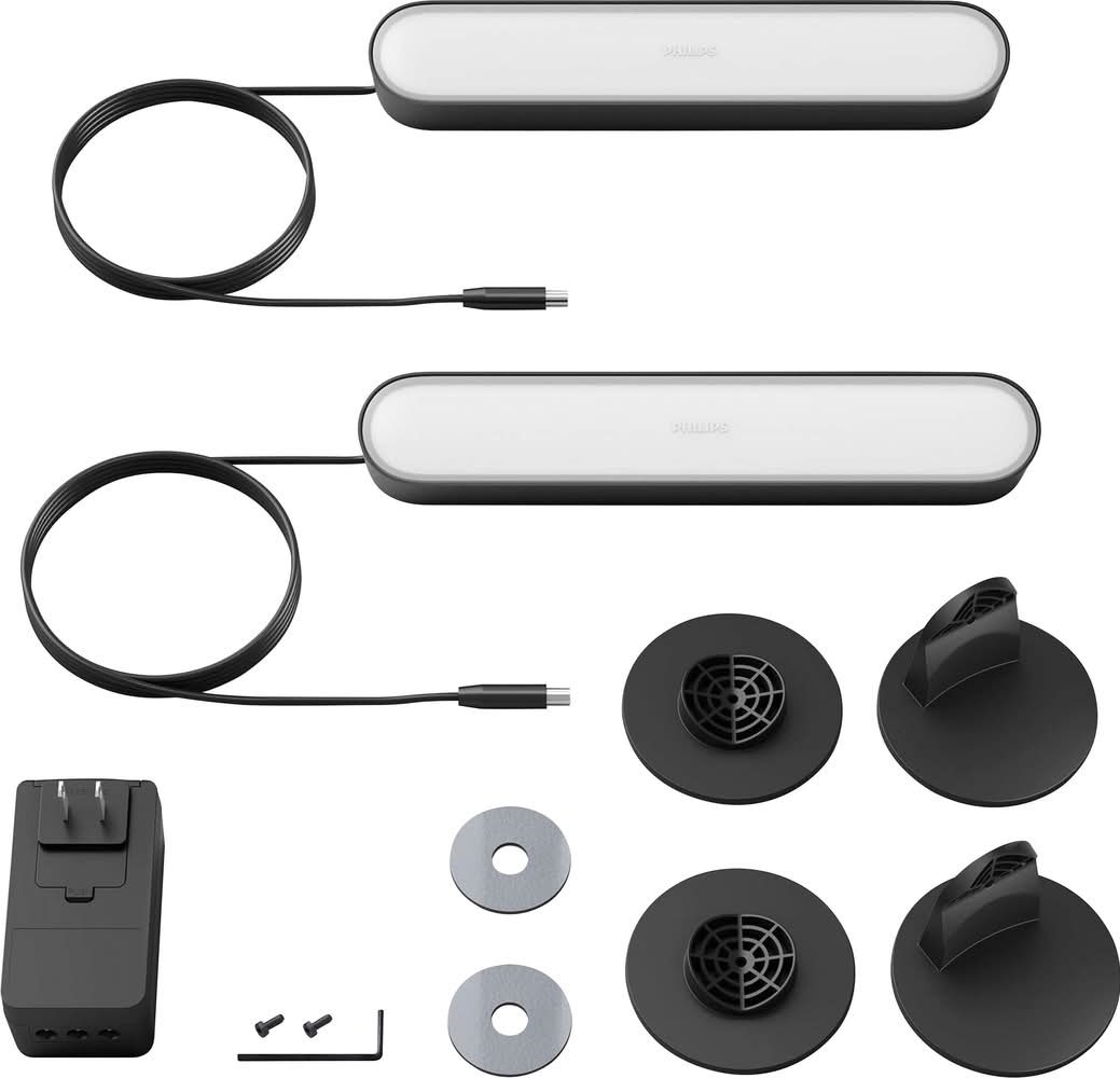 This base kit includes 2 color changing Hue Play light bars, mounting hardware, and 1 power supply with plug. Create a wash of colorful light with the sleek design of the Play light bar. Choose from 16 million colors to experience different light effects. Select preset scenes with dynamic effects or create your own in the Hue app. Lay them horizontally on the floor or stand vertically on a cabinet or shelf. Create a TV backlight by mounting them to the back of the TV with the included mounts to enhance your home theater setup. Connect up to 3 light bars with one power supply (extension kits sold separately). Connect to a Hue Sync box (sold separately) to create immersive lighting experiences that sync in real time to your favorite movies, music, and video games. Hue lights can sync with music when you pair them with your Spotify account or listen to music using Samsung SmartThings in the Galaxy smartphone app. Take gaming to a whole new level when you sync Hue lights with Razer Chroma LED accessories and Corsair iCUE products. Requires a Hue Bridge (sold separately). Unlock the full power of Philips Hue smart home lighting with the Bridge and enjoy benefits like multi-room control, automations and smart control from anywhere in the world. Color: White and color ambiance