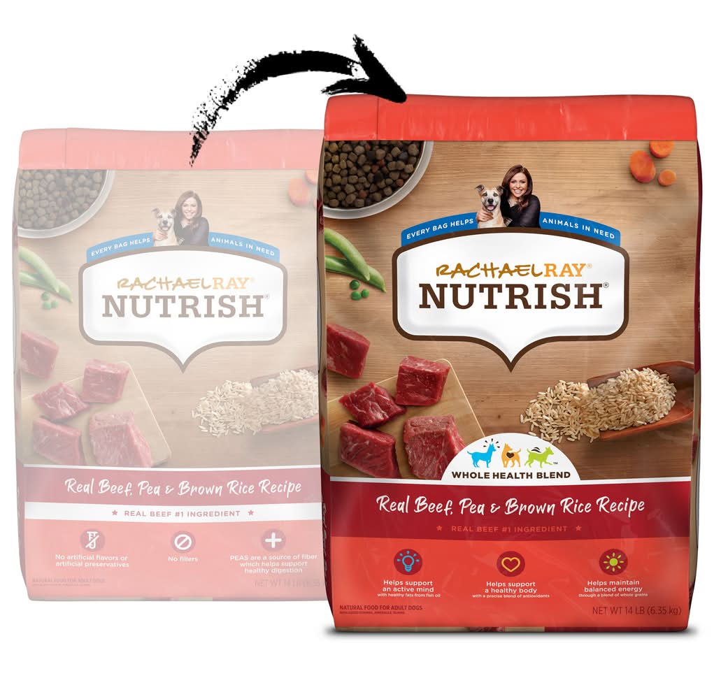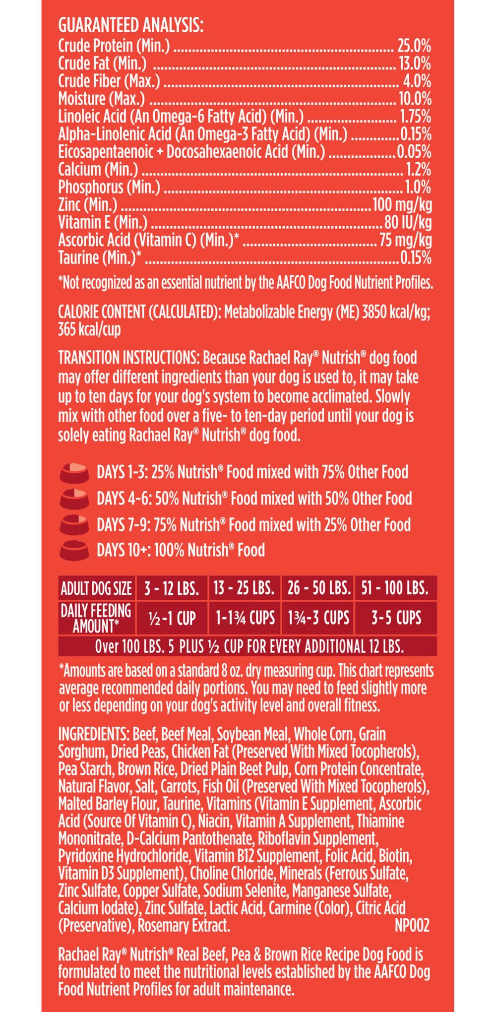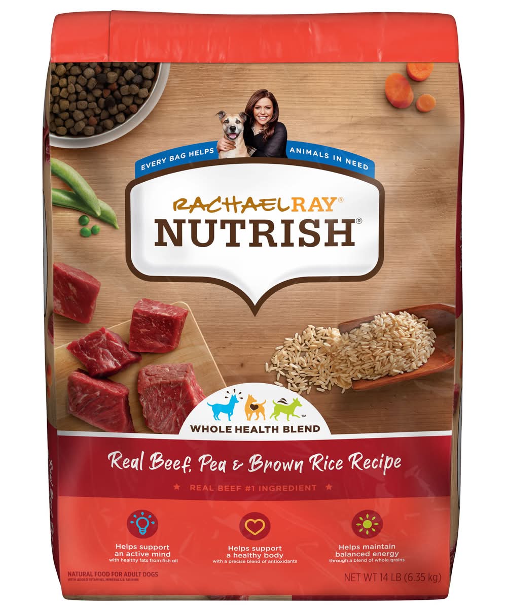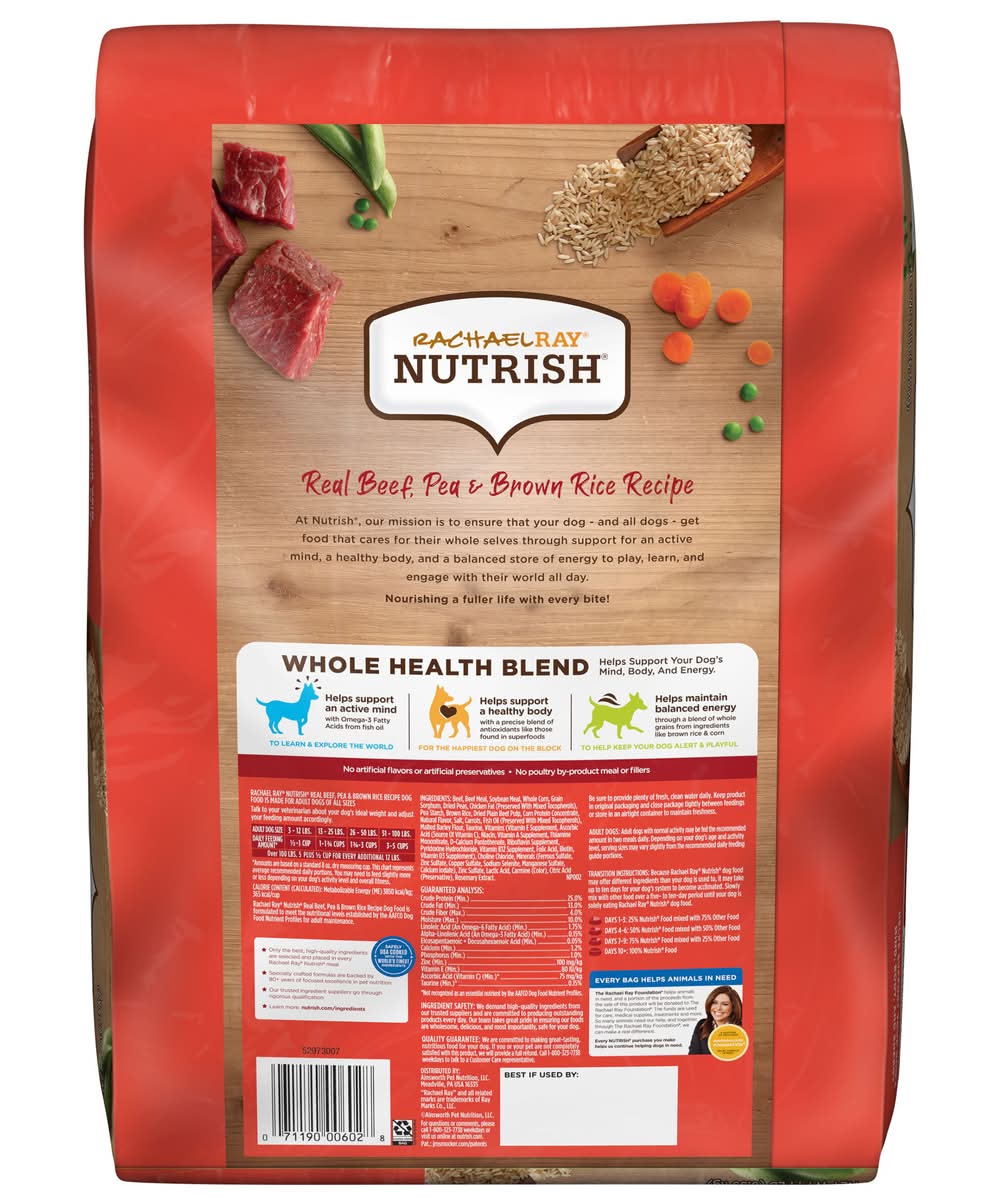 Rachael ray nutrish real beef, beef, pea & brown rice recipe dog food is made from adult dogs of all sizes. talk to your veterinarian about your dog鈥檚 ideal weight and adjust feeding amount accordingly. adult dog size: 3 to 12 lbs; daily feeding amount (amounts are based on a standard 8 oz dry measuring cup. this chart represents average recommended daily portions. you need to feed slightly more or less depending on your dog鈥檚 activity level and overall fitness): 1/2 to 1 1/4 cups. adult dog size: 13 to 25 lbs; daily feeding amount (amounts are based on a standard 8 oz dry measuring cup. this chart represents average recommended daily portions. you need to feed slightly more or less depending on your dog鈥檚 activity level and overall fitness): 1 1/4 - 2 cups. adult dog size: 26 to 50 lbs; daily feeding amount (amounts are based on a standard 8 oz dry measuring cup. this chart represents average recommended daily portions. you need to feed slightly more or less depending on your dog鈥檚 activity level and overall fitness): 2 to 3 1/2 cups. adult dog size: 51 to 100 lbs; daily feeding amount (amounts are based on a standard 8 oz dry measuring cup. this chart represents average recommended daily portions. you need to feed slightly more or less depending on your dog鈥檚 activity level and overall fitness): 3 1/2 to 5 3/4 cups. over 100 lbs 5 3/4 plus 1/2 cup for every additional 12 lbs. be sure to provide plenty of fresh, clean water daily. keep product in original packaging and close package tightly between feedings or store in an airtight container to maintain freshness. adult dogs: adult dogs with normal activity may be fed the recommended amount in two meals daily. depending on your dog鈥檚 age and activity level, serving sizes may vary slightly from the recommended daily guide portions. transition instructions: because rachael ray nutrish dog food may offer different ingredients than your dog is used to, it may take up to ten days for your dog鈥檚 system to become acclimated. slowly mix with other food over a five- to ten-day period until your dog is solely eating rachael ray nutrish dog food. day 1-3: 25% nutrish food mixed with 75% other food. day 4-6: 50% nutrish food mixed with 50% other food. day 7-9: 75% nutrish food mixed with 25% other food. day 10+: 100% nutrish food.