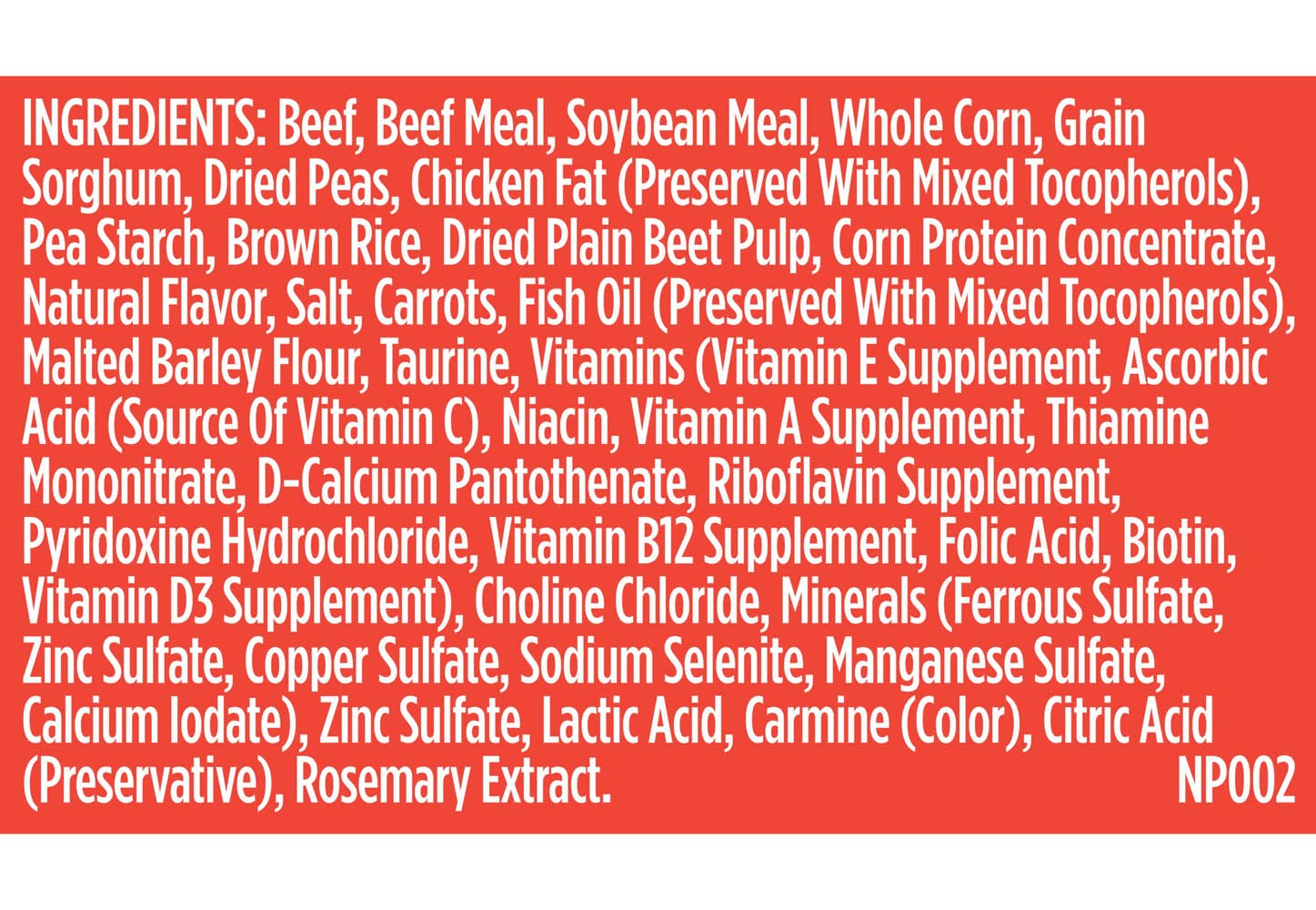 Ingredients: Beef, Beef Meal, Soybean Meal, Whole Corn, Grain Sorghum, Dried Peas, Chicken Fat (preserved With Mixed Tocopherols), Corn Protein Concentrate, Brown Rice, Pea Starch, Dried Plain Beet Pulp, Natural Flavor, Salt, Carrots, Malted Barley Flour, Calcium Carbonate, Taurine, Zinc Sulfate, Choline Chloride, Vitamin E Supplement, Ascorbic Acid (source Of Vitamin C), Ferrous Sulfate, Niacin, Copper Sulfate, Vitamin A Supplement, Citric Acid (preservative), Sodium Selenite, Annatto Extract (color), Thiamine Mononitrate, D-calcium Pantothenate, Manganese Sulfate, Riboflavin Supplement, Pyridoxine Hydrochloride, Rosemary Extract, Vitamin B12 Supplement, Calcium Iodate, Folic Acid, Biotin, Vitamin D3 Supplement Contains: Soybeans