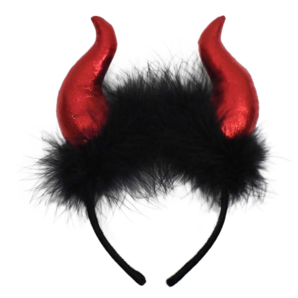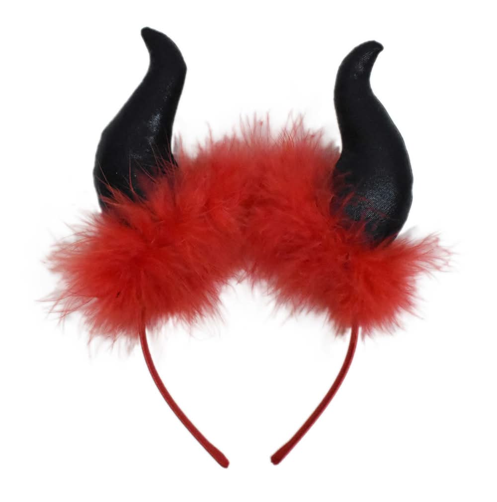 Wear this fun headband to show off your cute devilish side! Two assorted styles - metallic devil horns attached to a fur or black devil horns attached to red fur. 70% polyester, 25% plastic, 5% feather for adult use only, not a toy. Keep away from open flame. Spot clean only • Color: Red-black • Size: OS