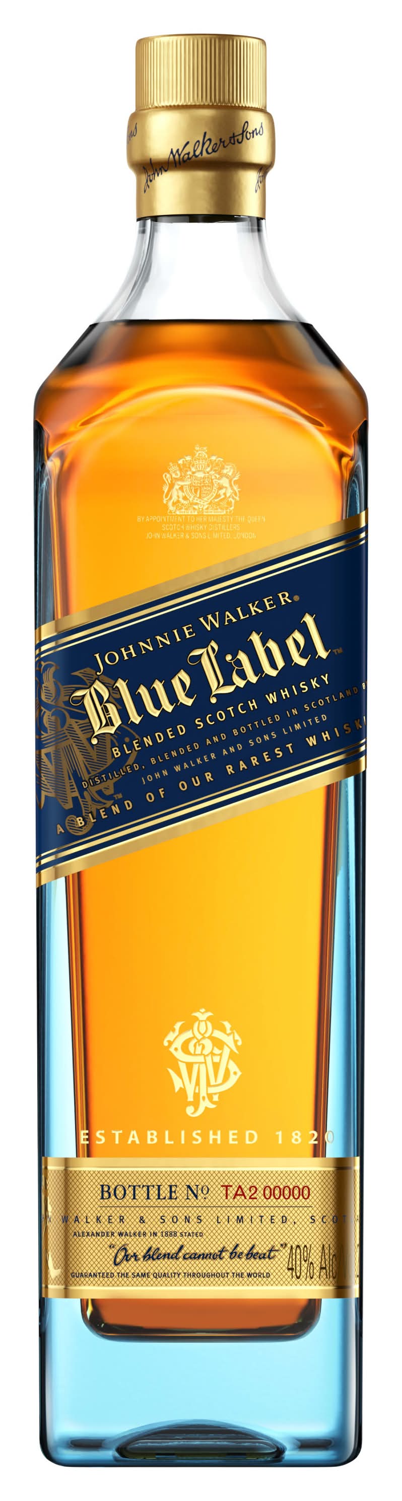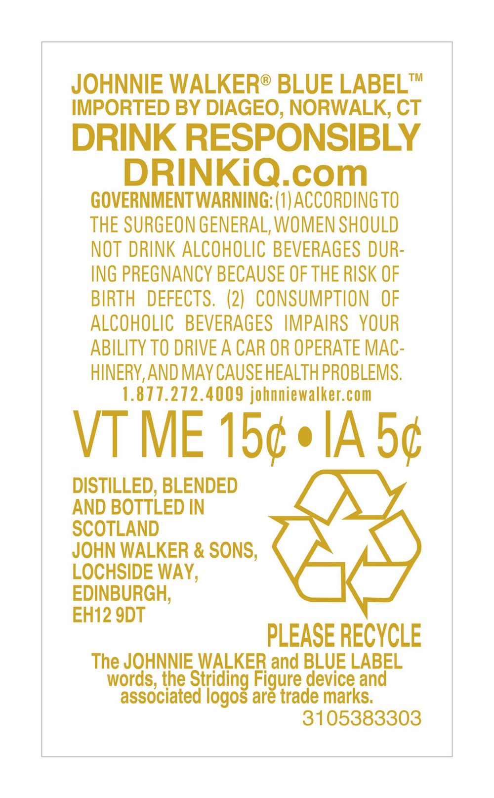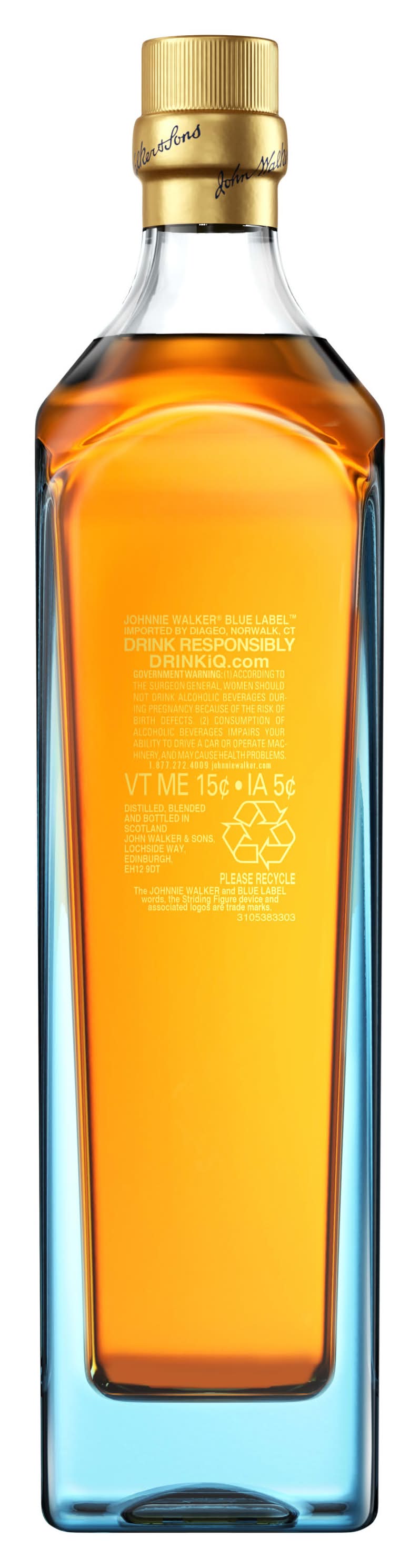 Unlock the ultimate whisky experience with Johnnie Walker Blue Label Blended Scotch Whisky, a velvety smooth and vibrant Scotch crafted using rare hand-selected whiskies from the four corners of Scotland. Only 1 in 10,000 casks from our unparalleled reserves of ageing Scotch – including some from long-closed ‘ghost’ distilleries – have the remarkable depth of character needed to craft this exceptionally smooth whisky. Every sip of Johnnie Walker Blue Label is a journey through a rich and complex flavor profile. Rolling waves of rich spice lead to a deep surge of vanilla sweetness and honey, with caramel and hazelnut notes coursing through dark chocolate undertones. The luxuriously long, smoky finish completes the experience. For maximum enjoyment of Johnnie Walker Blue Label, it's recommended to prepare your palate with iced water before savoring each sip. Includes one 80 proof 200 mL bottle of Blue Label Blended Scotch Whisky. Please drink responsibly. • Alcohol by volume: 40% • Diageo - ProductXM, 175 Greenwich Ave, Greenwich, CT 06830 • Packaging: Reusable