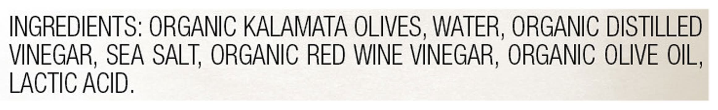 Organic Kalamata Olives, Water, Organic Distilled Vinegar, Sea Salt, Organic Red Wine Vinegar, Organic Olive Oil, Lactic Acid Contains: 'Free From Gluten'