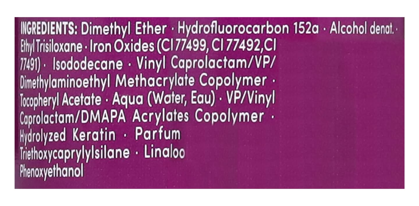 Ingredients: Dimethyl Ether, Hydrofluorocarbon 152a, Alcohol Denat, Ethyl Trisiloxane, Iron Oxides (CI 77499, CI 77492, CI 77491), Isododecane, Vinyl Caprolactam/VP/Dimethylaminoethyl Methacrylate Copolymer, Tocopheryl Acetate, Aqua (Water, Eau), VP/Vinyl Caprolactam/DMAPA Acrylates Copolymer, Hydrolyzed Keratin, Parfum (Fragrance), Triethoxycaprylylsilane, Linalool, Citronellol, Phenoxyethanol