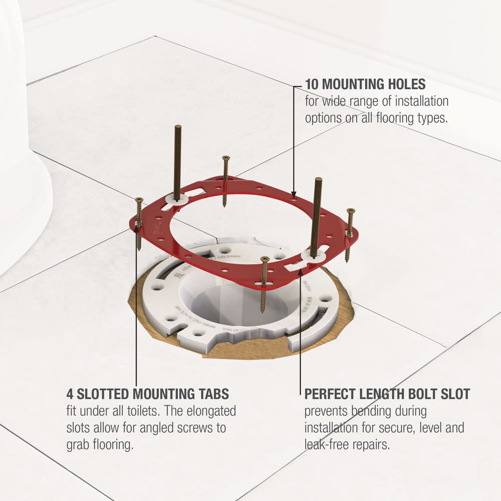 For repairing broken, cracked or worn-out toilet flanges. Engineered for secure connection to the floor. Ensures the elimination of leak paths. Adjustable after the toilet compresses on the wax. Allows for use with both 1/4-in and 5/16-in T-bolts. Features 4 slotted mounting tabs that fit under all toilets. Elongated slots allow for angled screws to grab flooring. Includes 10 mounting holes for a wide range of installation options. Easy to install and user friendly. Color: Red