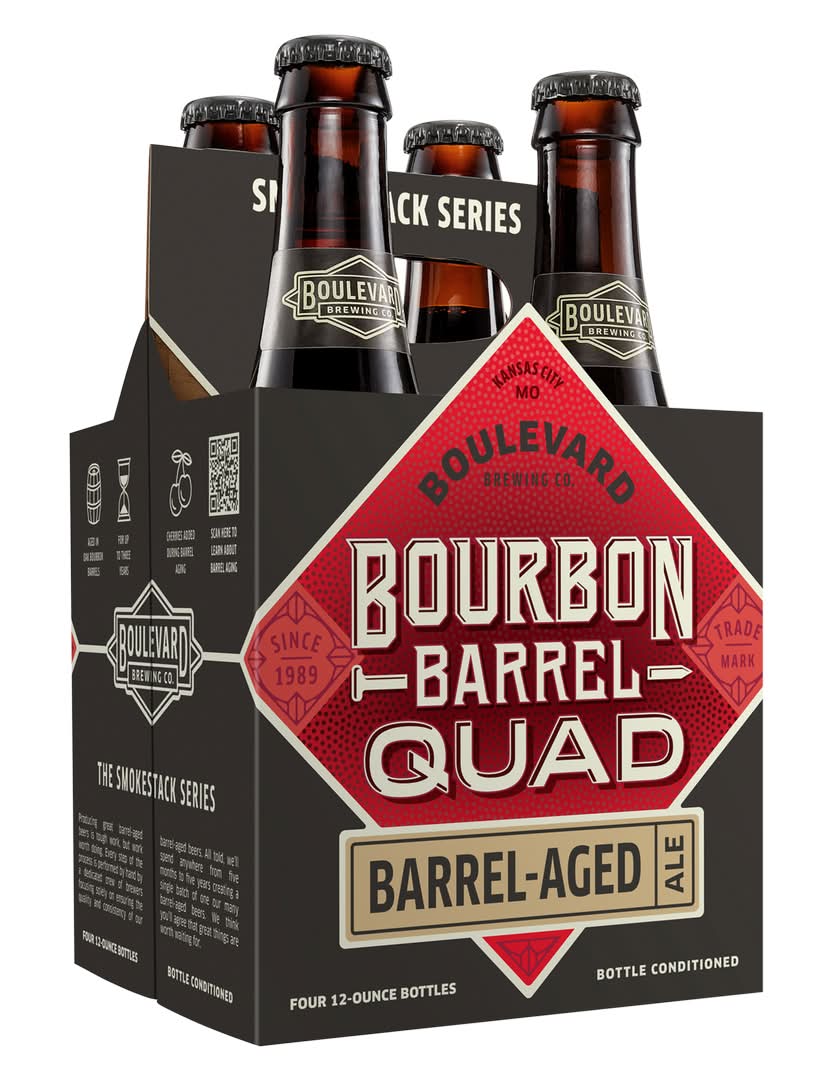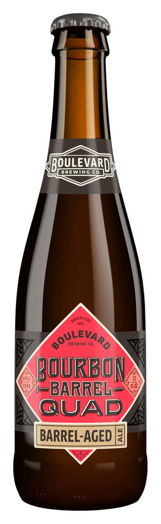 Boulevard Brewing Company Bourbon Barrel Quad Beer is an abbey-style quadrupel aged in oak bourbon barrels for varying periods, with some barrels aging the brew for up to three years. During the aging process, cherries are introduced to compensate for the natural evaporation loss known as the "angel's share." The final blend is selected for optimal flavor, yielding a beer with understated cherry notes and prominent toffee and vanilla characteristics. • Pack size: 4 • Alcohol by volume: 11.2%
