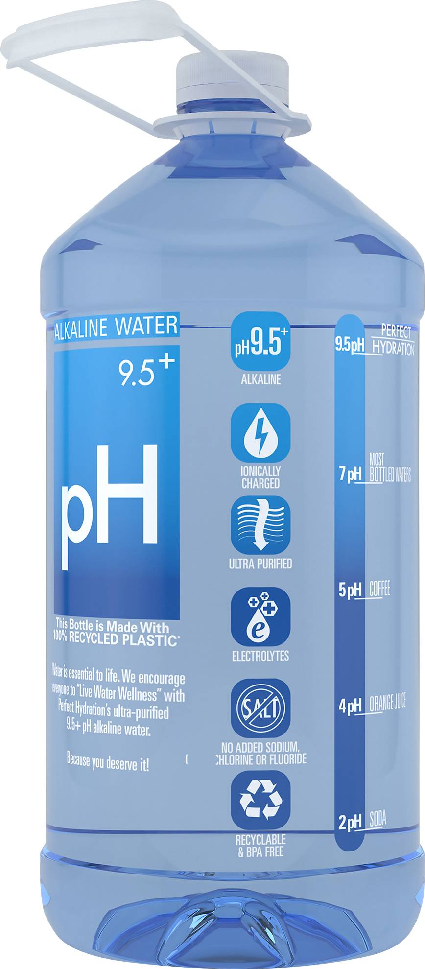 No sodium, chlorine, fluoride. Water is essential to life. We encourage everyone to live Water Wellness with Perfect Hydration’s ultra-purified 9.5 pH alkaline water. Because you deserve it. Ionically charged. Ultra purified. Electrolytes. 9.5 pH. 7 pH in most bottled waters. 5 pH coffee. 4 pH orange juice. 2 pH soda. Scan for water quality information. • Stratus Group, Los Angles, CA, 90058, Ph: 800-279-9129. • Packaging: Reusable