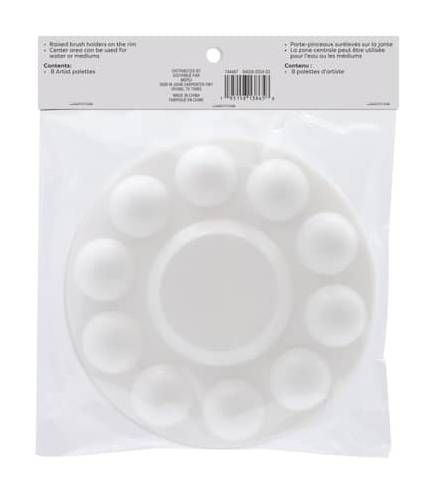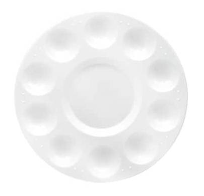These artist palettes feature ten wells and one large well in the center for water or a medium. The raised brush holders on the rim make it easy to keep your area clean and free of stray paint. 7.75" (19.7 cm) diameter. Polypropylene.