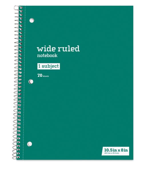 Don't miss an important memo at the office or in the classroom. This spiral notebook features plenty of lined pages to help you organize thoughts or just kick back and start work on a creative writing piece. 3-hole punched to fit into most standard binders. Wide ruled, lined pages help you keep notes in order. Acid-free sheets stand up to fading. Perforated to let you hand in assignments. Spiral binding for quick page flipping. Chipboard backing makes the pages easy to write on. Just Basics spiral notebook is wide ruled with 70 sheets (140 pages). Color: White