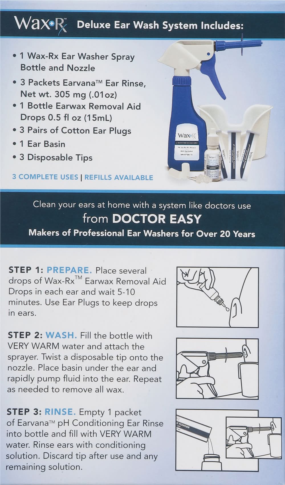 Directions for use: Usage of instructions:Step 1: Prepare. Place several drops of Wax-Rx earwax removal aid drops in each ear and wait 5-10 minutes. Use ear plugs to keep drops in ears. Step 2: Wash. Fill the bottle with very warm water and attach the sprayer. Twist a disposable tip onto the nozzle. Place basin under the ear and rapidly pump fluid into the ear. Repeat as needed to remove all wax. Step 3: Rinse. Empty 1 packet of Earvana pH conditioning ear rinse into bottle and fill with very warm water. Rinse ears with conditioning solution. Discard tip after use and any remaining solution. - Directions: Adults and Children Over 12 Years of Age: Tilt head sideways and place 5-10 drops into ear. Tip of applicator should not enter ear canal. Keep drops in ear for several minutes by keeping head tilted or placing cotton in ears. Flush ear with very warm (body temperature) water using the Wax-Rx Ear Washer. Children Under 12: Consult a physician. Drops may be used twice daily for up to 4 days or as directed by a physician. Step 1: Prepare. Place several drops of Wax-Rx earwax removal aid drops in each ear and wait 5-10 minutes. Use ear plugs to keep drops in ears. Step 2: Wash. Fill the bottle with very warm water and attach the sprayer. Twist a disposable tip onto the nozzle. Place basin under the ear and rapidly pump fluid into the ear. Repeat as needed to remove all wax. Step 3: Rinse. Empty 1 packet of Earvana pH conditioning ear rinse into bottle and fill with very warm water. Rinse ears with conditioning solution. Discard tip after use and any remaining solution. Earvana pH Conditioning Ear Rinse: Other Information About Ascorbic Acid: Store in a cool, dry place away from heat and light. Keep Earvana pH Conditioning Ear Rinse closed until ready to use. Storage recommendation: Earvana pH Conditioning Ear Rinse: Other Information About Ascorbic Acid: Store in a cool, dry place away from heat and light. Keep Earvana pH Conditioning Ear Rinse closed until ready to use.