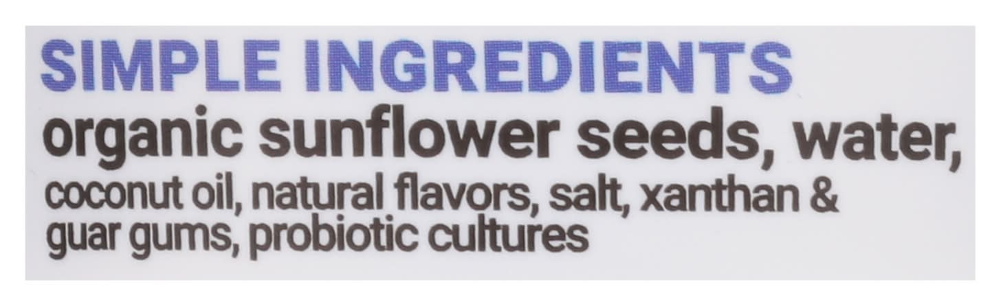 Organic Sunflower Seeds, Water, Coconut Oil, Natural Flavors, Salt, Xanthan & Guar Gums, Probiotic Cultures Contains: Tree Nuts, Coconuts Additives: None