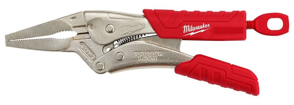 The MILWAUKEE 6-inch TORQUE LOCK Long Nose Locking Pliers with Grip provides users with faster tool setup and more locking force. The locking pliers' unique thumb screw provides users with a more convenient geometry for better hand force while providing clearance to generate more torque with the screwdriver through-hole design. The pliers are made from forged alloy steel for maximum durability with hardened jaws for increased gripping power, perfect for the toughest of jobsites. Milwaukee offers a Limited Lifetime Warranty with all locking tools. Size: 6 In