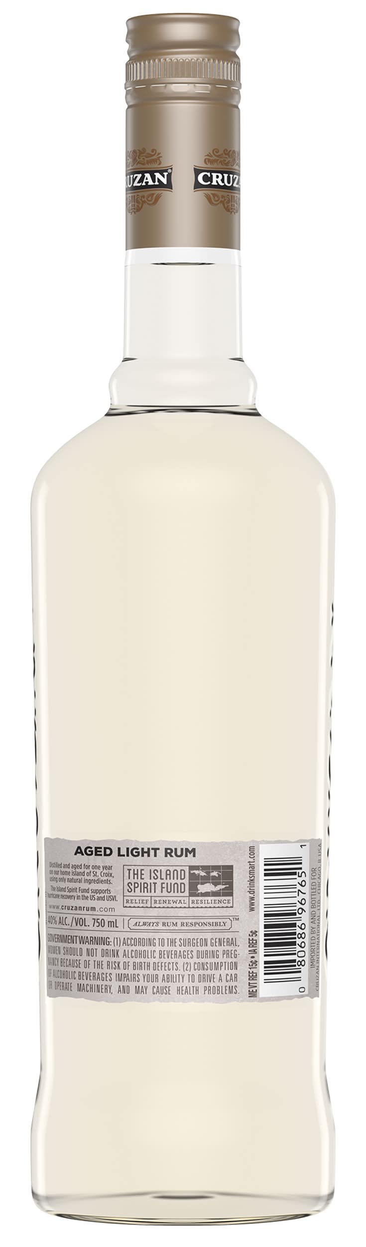 Cruzan Aged Light Rum is a blend of rums aged one to four years in American oak casks-then treated to a filtration process that brings out the full-bodied taste. The light color resembles that of chardonnay, a distinctive indication of its aging. Exceptionally smooth, this rum offers a dry, clean taste with vanilla overtones and a pleasant finish. It's smooth enough to sip neat, but shines as the base for most traditional cocktails. Try a refreshing Caipirissima by muddling lime wedges with one part simple syrup; add two parts Cruzan Aged Light Rum and ice. Based in St. Croix and operated by the Nelthropp family since the early 1800s, every bottle of Cruzan Rum captures the unique spirit of the island. • Alcohol by volume: 40% • Beam Suntory,