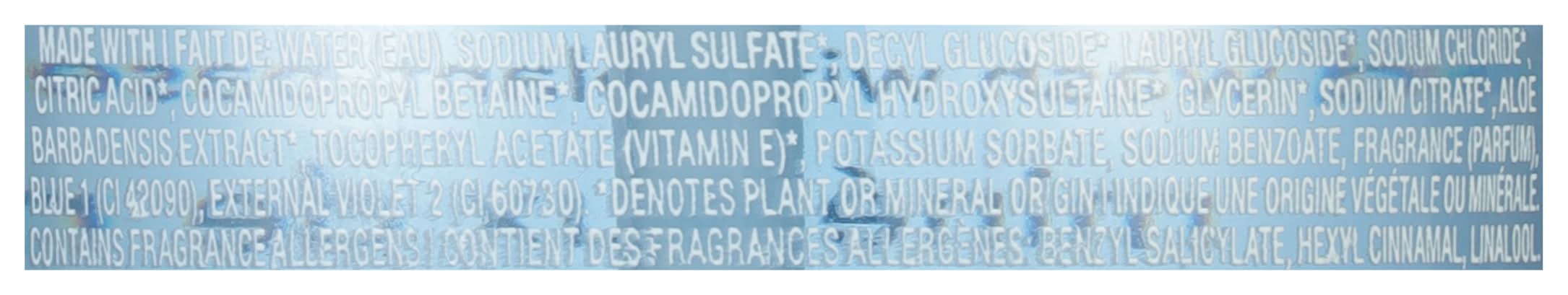 Made with Fait De: Water (Eau), Sodium Lauryl Sulfate (Denotes Plant or Mineral Origin), Decyl Glucoside (Denotes Plant or Mineral Origin), Lauryl Glucoside (Denotes Plant or Mineral Origin), Sodium Chloride (Denotes Plant or Mineral Origin), Citric Acid (Denotes Plant or Mineral Origin), Cocamidopropyl Betaine (Denotes Plant or Mineral Origin), Cocamidopropyl Hydroxysultaine (Denotes Plant or Mineral Origin), Glycerin (Denotes Plant or Mineral Origin), Sodium Citrate (Denotes Plant or Mineral Origin), Aloe Barbadensis Extract (Denotes Plant or Mineral Origin), Tocopheryl Acetate (Vitamin E) (Denotes Plant or Mineral Origin), Potassium Sodium Benzdoate, Fragrance (Parfum), Blue1 (CI 42090), External Violet 2 (CI 60730) Contains: None Additives: None