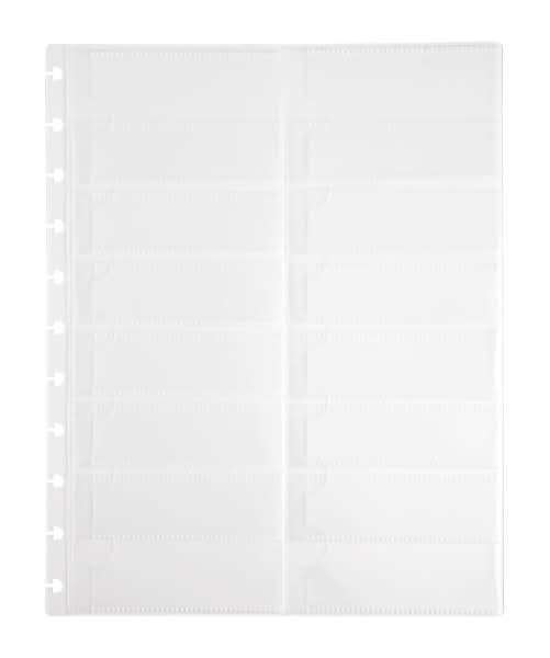 Tul Discbound Notebook Business Card Pages are designed with 14 card slots per page, each capable of holding two cards, front and back. These transparent, durable plastic pages allow for clear visibility of the card contents and can accommodate up to 84 business cards in total. They are compatible with any letter-size Tul discbound notebook or planner, providing a convenient solution for organizing and accessing contact information.