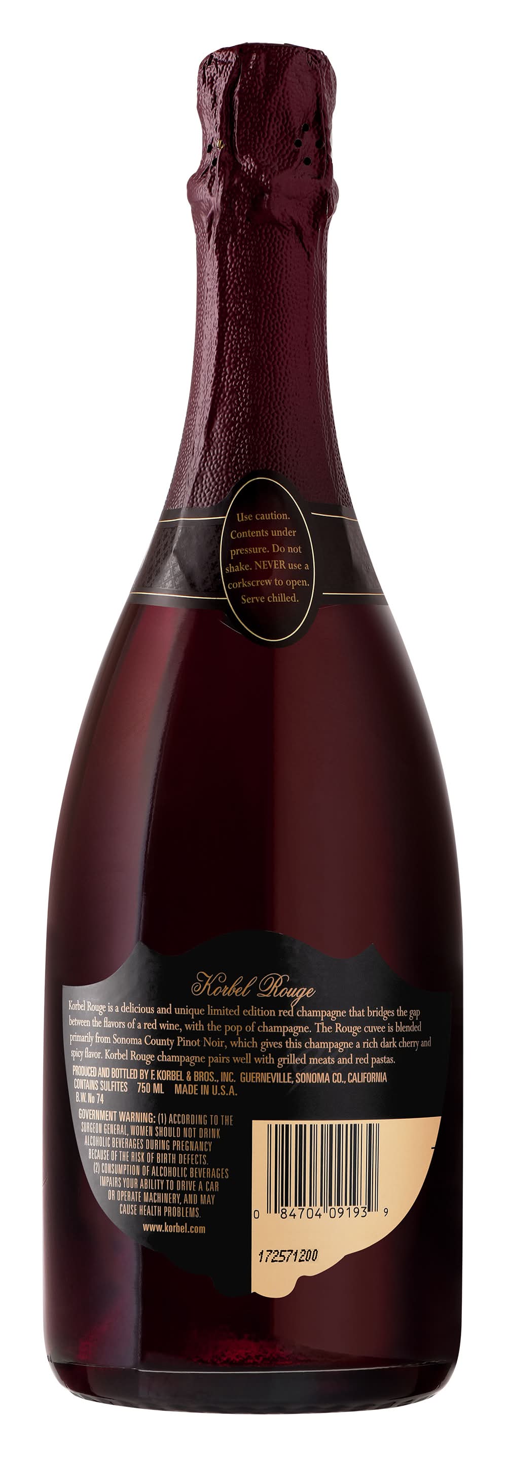 Korbel Rouge is a medium-dry sparkling red wine crafted from Pinot Noir grapes sourced from the Russian River Valley. It features a distinctive color with flavors of black cherry, strawberry, and plum, complemented by bright tannins and earthy herbal notes. Alcohol by volume: 12%