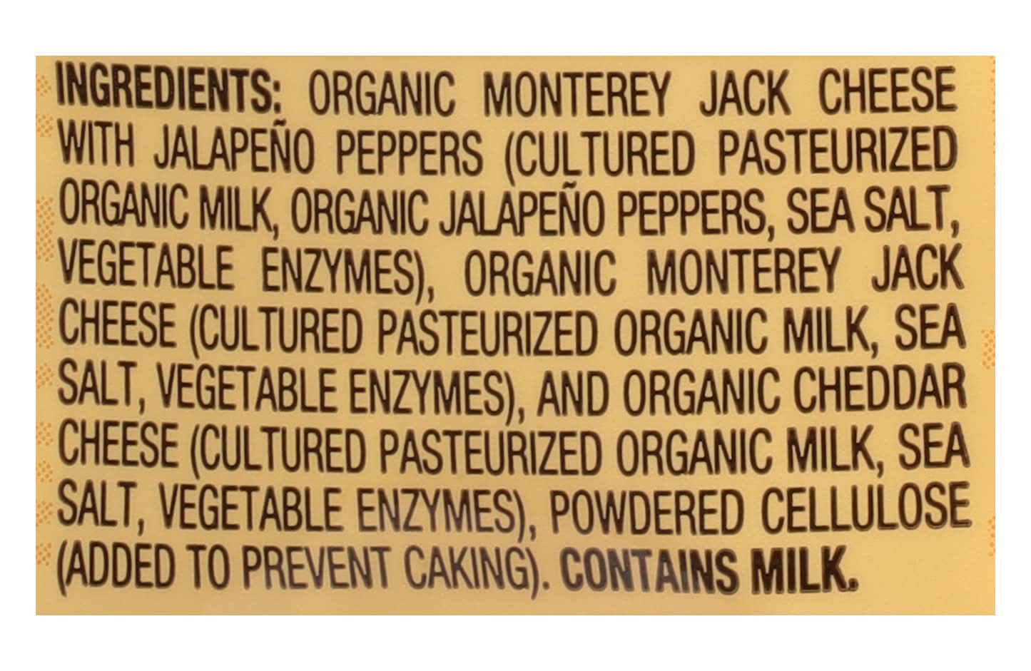 Organic Monterey Jack Cheese with Jalapeno Peppers (Cultured Pasteurized Organic Milk, Organic Jalapeno Peppers, Sea Salt, Vegetable Enzymes), Organic Monterey Jack Cheese (Cultured Pasteurized Organic Milk, Sea Salt, Vegetable Enzymes), and Organic Cheddar Cheese (Cultured Pasteurized Organic Milk, Sea Salt, Vegetable Enzymes), Powdered Cellulose (Added to Prevent Caking) Contains: Milk
