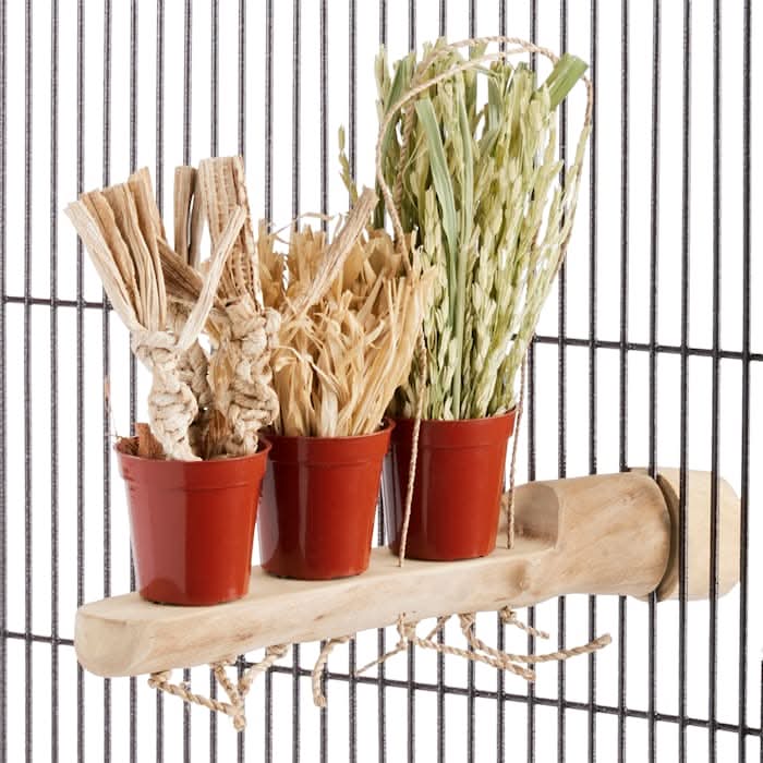 Add a natural element to your bird's habitat with the You & Me Plant Trio Toy. The Java wood perch includes plastic pots, palm leaves, banana leaves, rice sprigs, coconut husks and a water grass twin to help stimulate your bird's mind as they look, locate and retrieve exactly what they'd like to play with. 11.6 in x 2.16 in