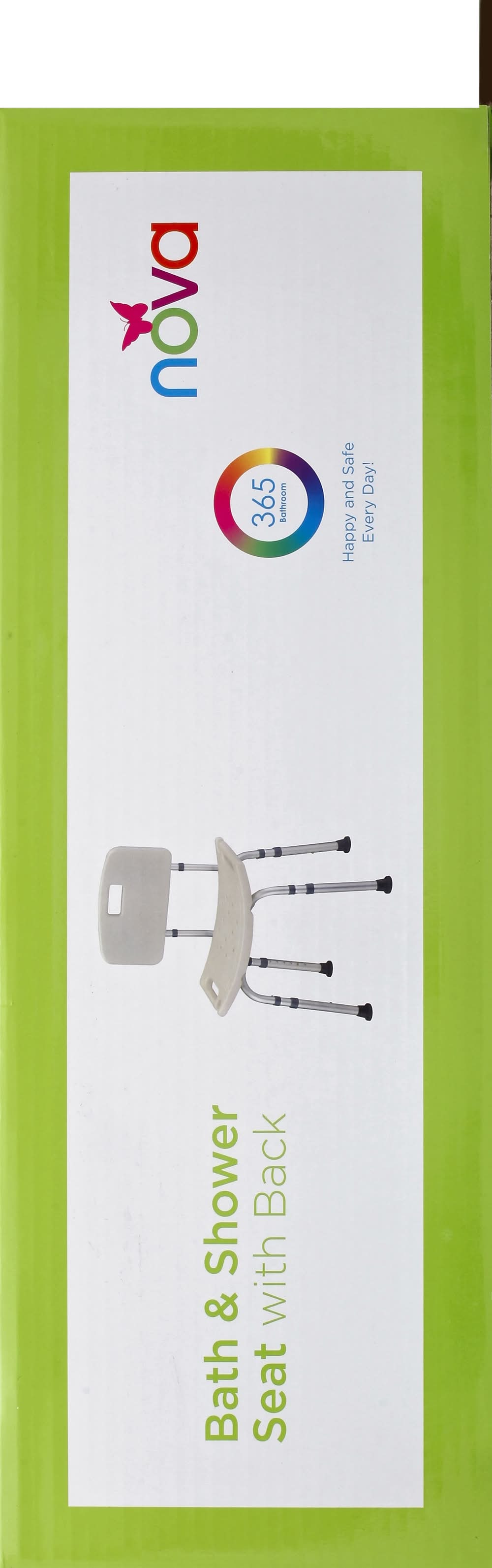 Seat Dimensions: 20 inches W x 12 inches D. Height Adjustment: 15 inches to 19 inches. Weight Capacity: 300 lb. Easy to assemble. No tools required. Products for an independent life. Easy to assemble patented twist and lock design. Convenient hand held shower holder. Latex-free. Provides comfortable seating while bathing. Convenient hand held shower holder. Heavy duty molded plastic. Slip resistant rubber tips. Non corrosive aluminum legs will not rust. Made in China. NOVA ORTHO-MED,