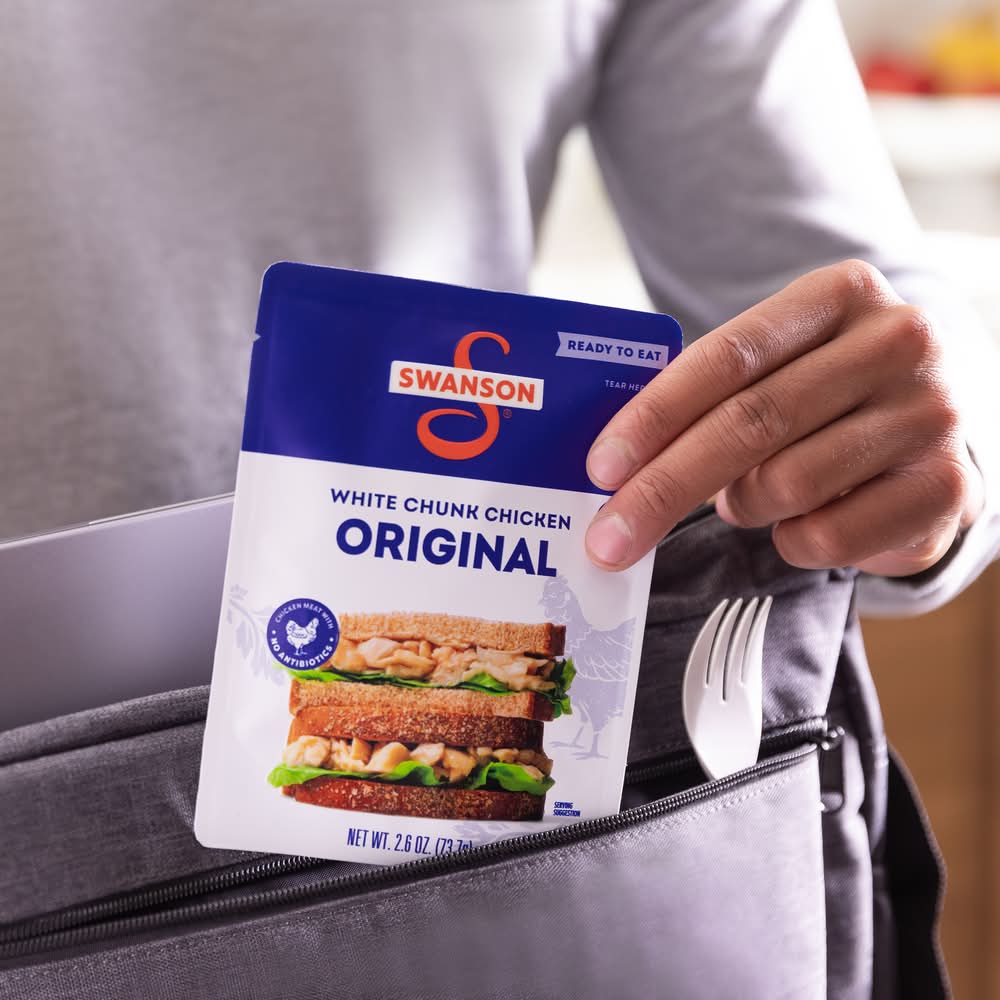 Experience the ultimate in convenience and flavor with Swanson Original White Chunk Fully Cooked Chicken - the perfect solution for easy, protein-rich meals that satisfy your cravings and fuel your day. Living up to Swanson’s tradition of simple ingredients, our tender chunks of diced chicken breast contain no antibiotics or added MSG. This premium white chicken is 97% fat-free, gluten-free and has 12 grams of protein in each 2.6-ounce serving. The easy-to-open pouch of precooked chicken is ready to enjoy with no need to drain, allowing you to indulge in a matter of seconds without any hassle. Each 2.6-ounce pouch contains 1 serving of precooked chicken chunks. Enjoy it with a hearty chicken salad, a flavorful sandwich, or as a quick snack with crackers. Swanson Original White Chunk Fully Cooked Chicken Pouches allow you to enjoy quick and satisfying chicken meals wherever you are, making them perfect for busy individuals and outdoor enthusiasts. • Flavor: White chunk chicken • Packaging: Reusable