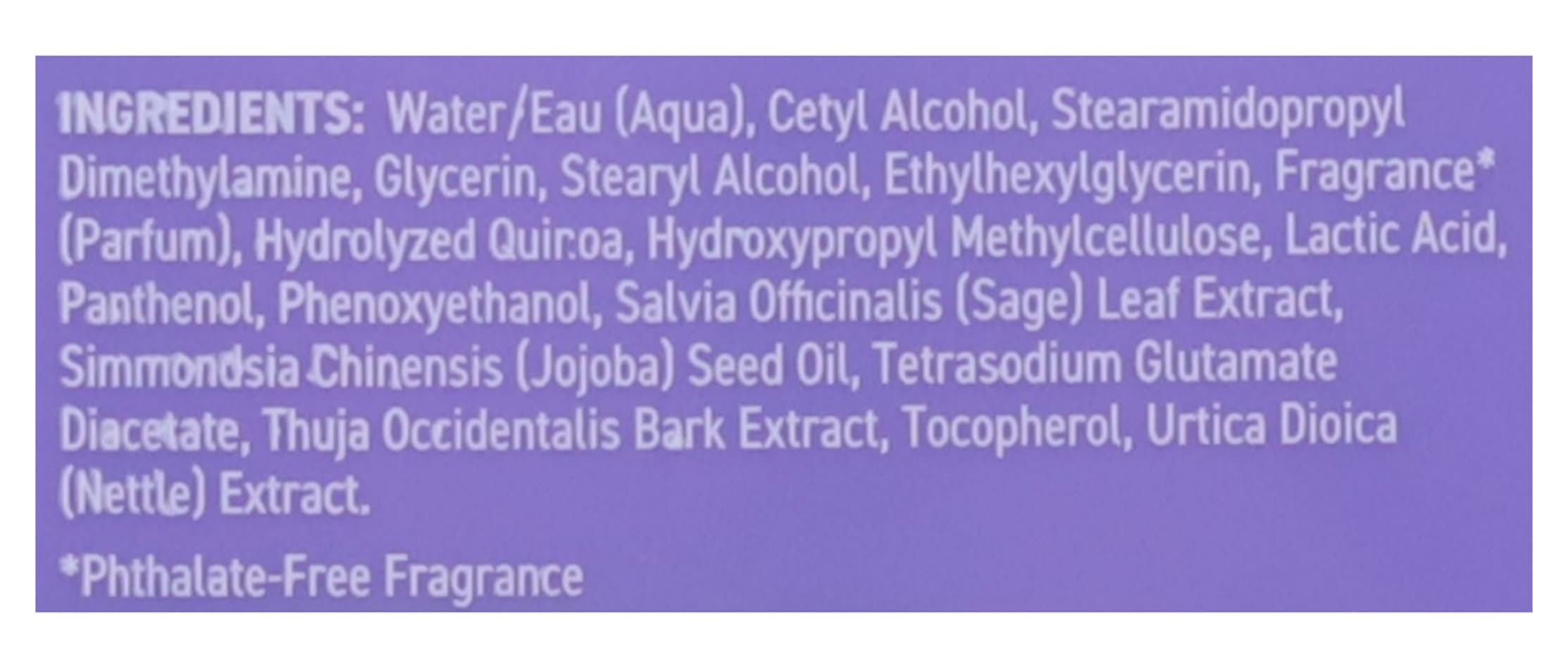 Ingredients: Water/Eau (Aqua), Cetyl Alcohol, Stearamidopropyl Dimethylamine, Glycerin, Stearyl Alcohol, Ethylhexylglycerin, Fragrance* (Parfum), Hydrolyzed Quiroa, Hydroxypropyl Methylcellulose, Lactic Acid, Panthenol, Phenoxyethanol, Salvia Officinalis (Sage) Leaf Extract, Simmondsia Chinensis (Jojoba) Seed Oil, Tetrasodium Glutamate Diacetate, Thuja Occidentalis Bark Extract, Tocopherol, Urtica Dioica (Nettle) Extract. * Phthalate-Free Fragrance