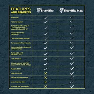 SharkBite Max push-to-connect fittings are the fastest way to connect PEX, copper, CPVC or PE-RT pipe. A newly designed stainless steel collet retainer delivers additional strength and durability and provides a 250 psi pressure rating. SharkBite Max fittings don't require a PEX tube liner and a re-engineered body WARNING: This product can expose you to chemicals known to the State of California to cause cancer and birth defects or other reproductive harm. For more information, go to www.P65Warnings.ca.gov Size: 1/2 in
