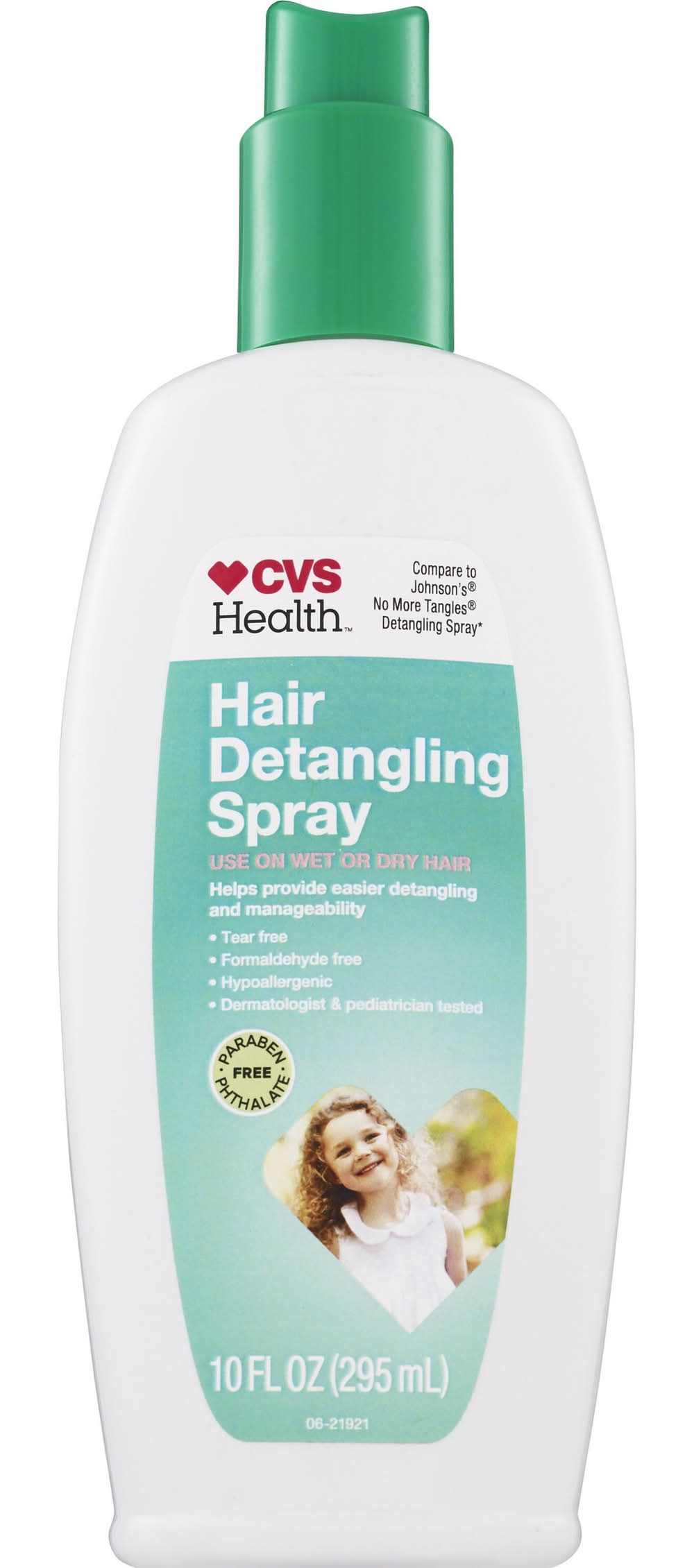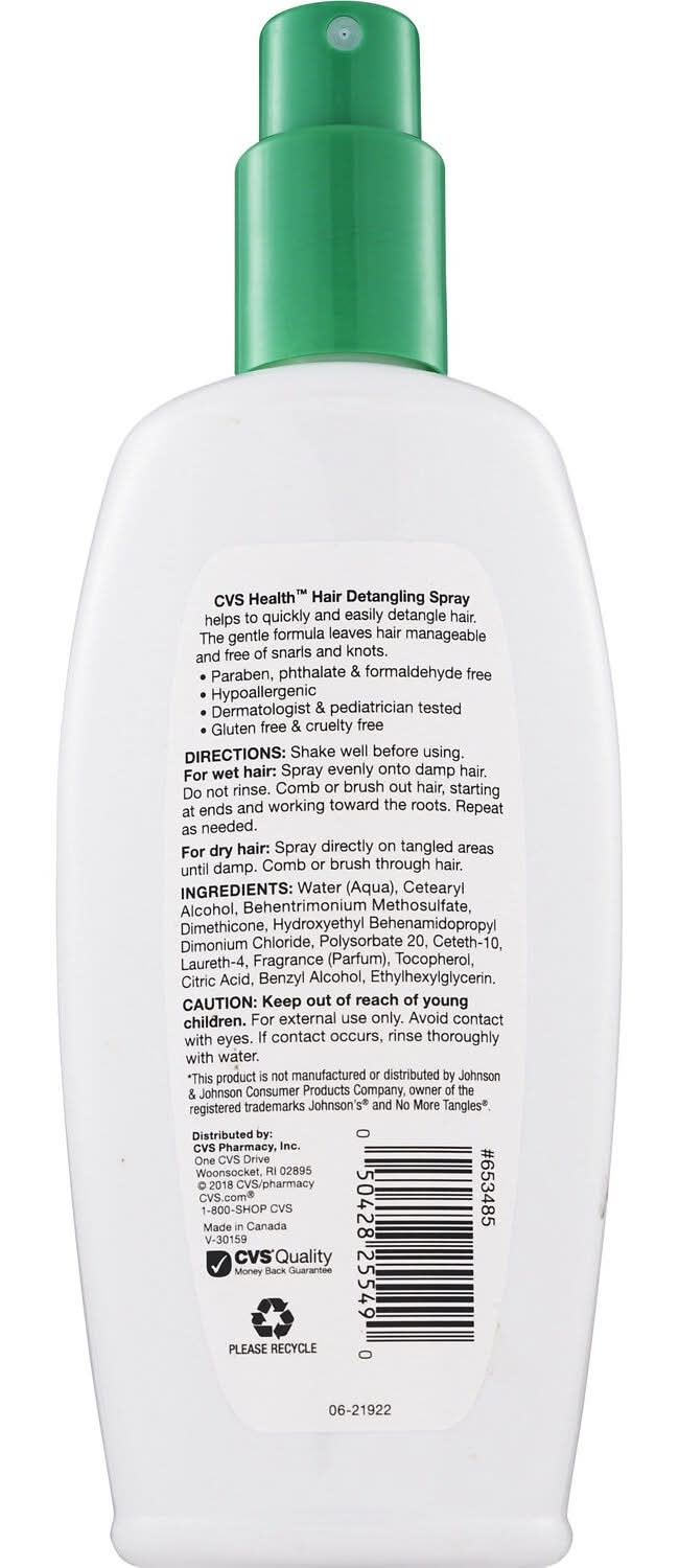 For wet or dry hair. Tear free. Improves manageability. Hypoallergenic. CVS/pharmacy Hair Detangler Spray is an improved tear-free formula that provides easier detangling and better manageability than before. Use it two ways to keep hair silky, shiny and tangle free. On wet hair after shampooing and to help unlock knots and snarls, and on dry hair between shampoos to keep hair neat and tangle free.
