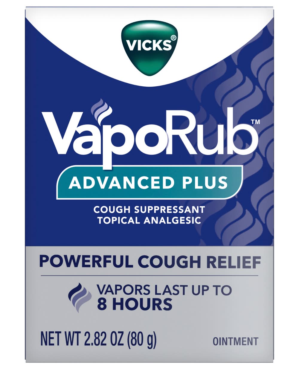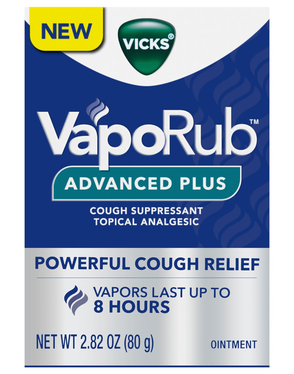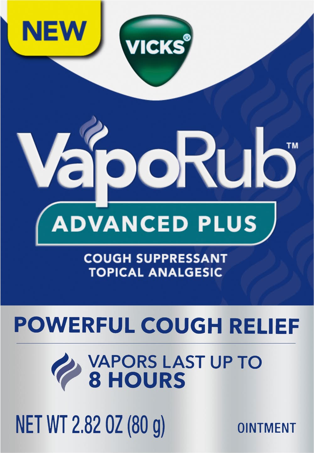 Vicks VapoRub Advanced Plus is chest rub and topical analgesic for your minor aches and pains. Brought to you by the world's it provides fast, powerful cough relief. It's specially formulated with three actives to help relieve your cough and provides a cooling sensation upon application. VapoRub is the answer to your cough, day or night. The active release Vicks Vapors last up to 8 hours. To use, rub a thick layer of the medicated ointment on your chest and throat to temporarily relieve your cough. Keep clothing loose around throat and chest to allow the Vicks Vapors to reach the nose and mouth and go straight to the source of your cough. Use up to three times daily or as directed by a doctor for soothing and comforting relief. VapoRub Advanced Plus can also be used as a topical analgesic to temporarily relieve minor aches and pains in your muscles and joints.