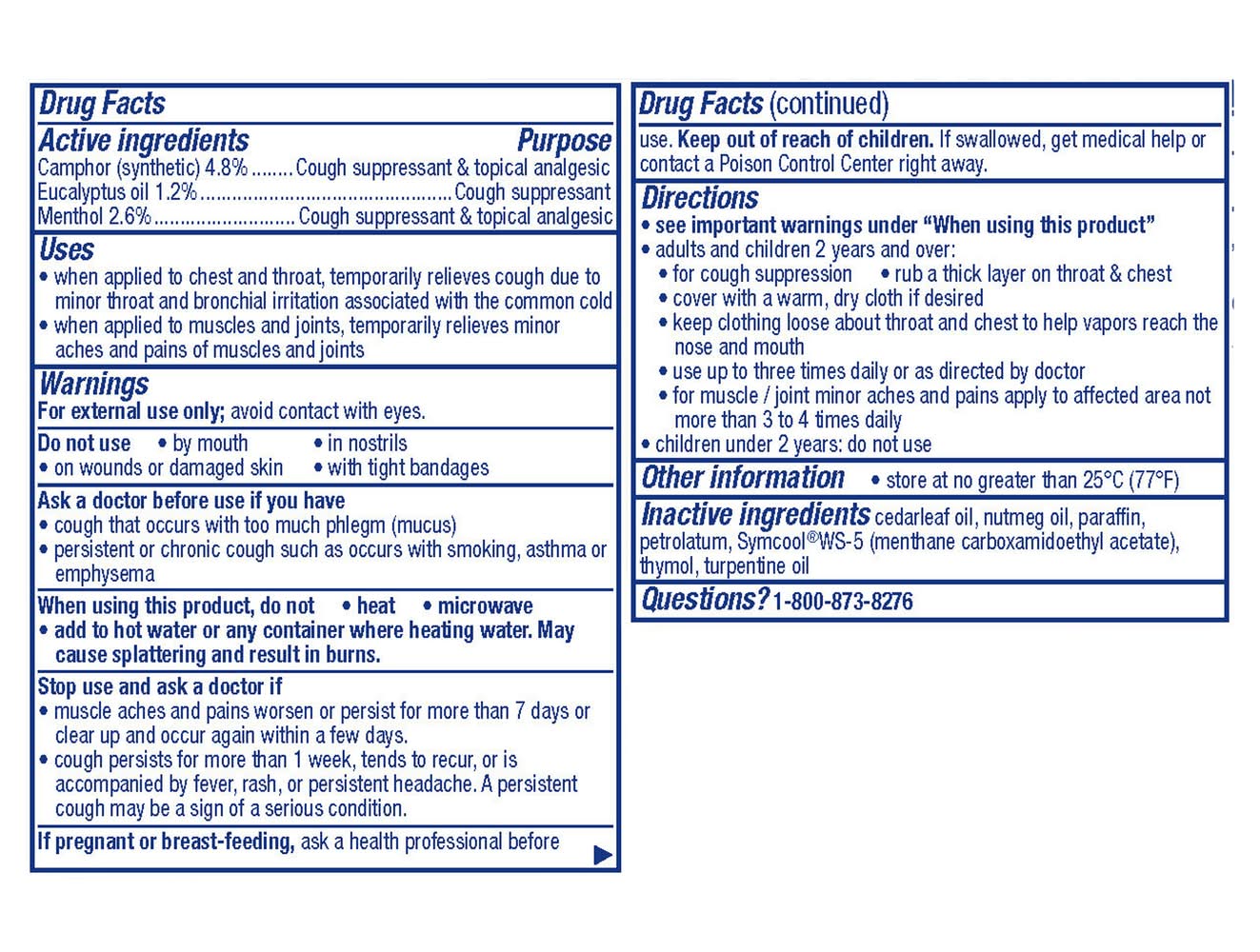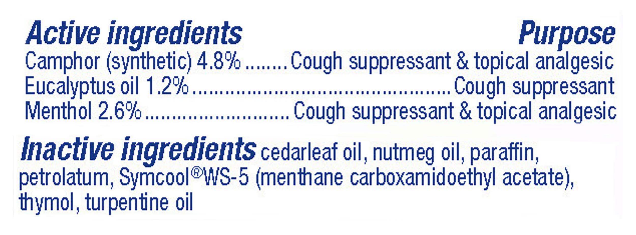 Ingredients: Active Ingredients: Camphor (Synthetic) (4.8 %), Cough Suppressant & Topical Analgesic; Eucalyptus Oil (1.2 %), Cough Suppressant; Menthol (2.6 %), Cough Suppressant & Topical Analgesic. Inactive Ingredients: Cedarleaf Oil, Nutmeg Oil, Paraffin, Petrolatum, Symcool WS-5 (Menthane Carboxamidoethyl Acetate), Thymol, Turpentine Oil Additives: Inactive Ingredients: Cedarleaf Oil Nutmeg Oil paraffin Petrolatum, Symcool WS-5 (Menthane Carboxamidoethyl Acetate) Thymol Turpentine Oil.