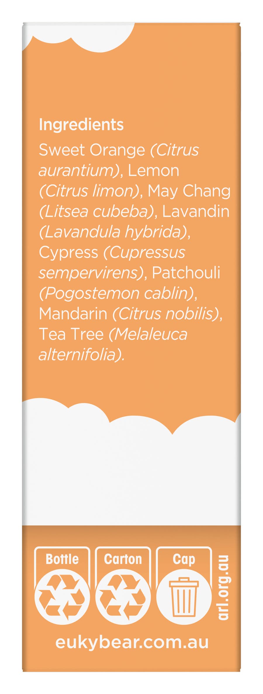 Sweet Orange (Citrus Aurantium), Lemon (Citrus Limon), May Chang (Litsea Cubeba), Lavandin (Lavandula Hybrida), Cypress (Cupressus Sempervirens), Patchouli (Pogostemon Cablin), Mandarin (Citrus Nobilis), Tea Tree (Melaleuca Alternifolia) Contains: N/A
