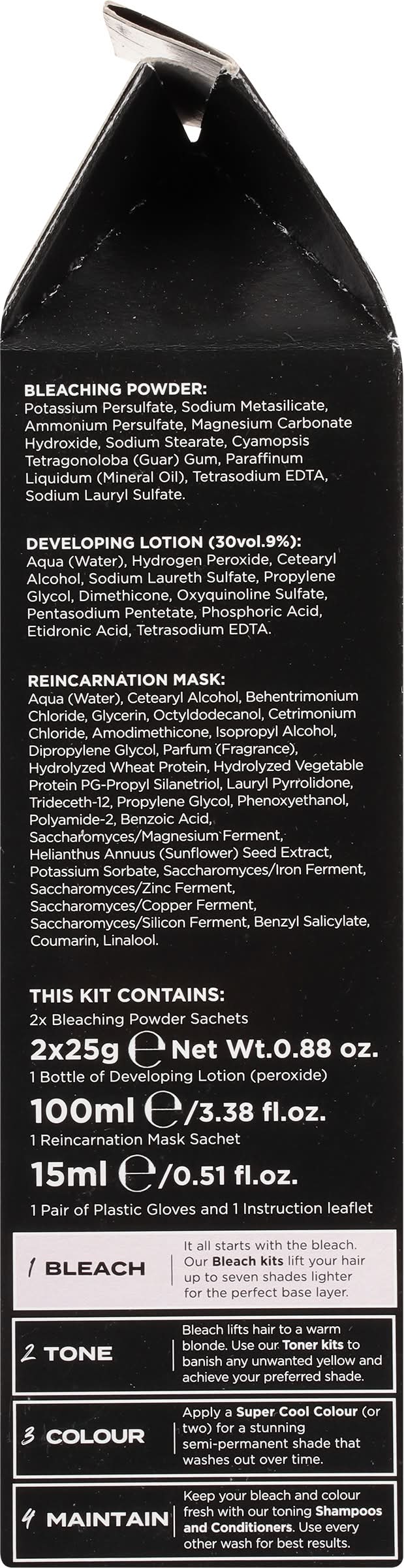 Usage of instructions:1. bleach: it all starts with the bleach. our bleach kits lift your hair up to seven shades lighter for the perfect base layer. 2. tone: bleach lifts hair to a warm blonde. use our toner kits to banish any unwanted yellow and achieve your preferred shade. 3. colour: apply a super cool colour (or two) for a stunning semi-permanent shade that washes out over time. 4. maintain: keep your bleach and colour fresh with our toning shampoos and conditioners. use every other wash for best results. - directions: 1. bleach: it all starts with the bleach. our bleach kits lift your hair up to seven shades lighter for the perfect base layer. 2. tone: bleach lifts hair to a warm blonde. use our toner kits to banish any unwanted yellow and achieve your preferred shade. 3. colour: apply a super cool colour (or two) for a stunning semi-permanent shade that washes out over time. 4. maintain: keep your bleach and colour fresh with our toning shampoos and conditioners. use every other wash for best results.