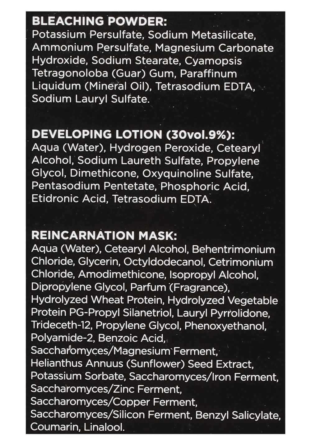 Ingredients: Bleaching Powder: Potassium Persulfate, Sodium Metasilicate, Ammonium Persulfate, Magnesium Carbonate Hydroxide, Sodium Stearate, Cyamopsis Tetragonoloba (Guar) Gum, Paraffinum Liquidum (Mineral Oil), Tetrasodium EDTA, Sodium Lauryl Sulfate. Developing Lotion (30vol.9%): Aqua (Water), Hydrogen Peroxide, Cetearyl Alcohol, Sodium Laureth Sulfate, Propylene Glycol, Dimethicone, Oxyquinoline Sulfate, Pentasodium Pentetate, Phosphoric Acid, Etidronic Acid, Tetrasodium EDTA. Reincarnation Mask: Aqua (Water), Cetearyl Alcohol, Behentrimonium Chloride, Glycerin, Octyldodecanol, Cetrimonium Chloride, Amodimethicone, Isopropyl Alcohol, Dipropylene Glycol, Parfum (Fragrance), Hydrolyzed Wheat Protein, Hydrolyzed Vegetable Protein PG-Propyl Silanetriol, Lauryl Pyrrolidone, Trideceth-12, Propylene Glycol, Phenoxyethanol, Polyamide-2, Benzoic Acid, Saccharomyces/Magnesium Ferment, Helianthus Annuus (Sunflower) Seed Extract, Potassium Sorbate, Saccharomyces/Iron Ferment, Saccharomyces/Zinc Ferment, Saccharomyces/Copper Ferment, Saccharomyces/Silicon Ferment, Benzyl Salicylate, Coumarin, Linalool Contains: Wheat