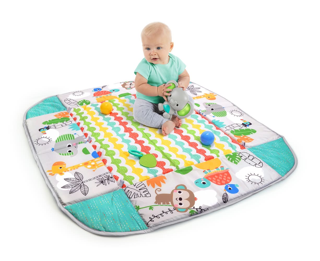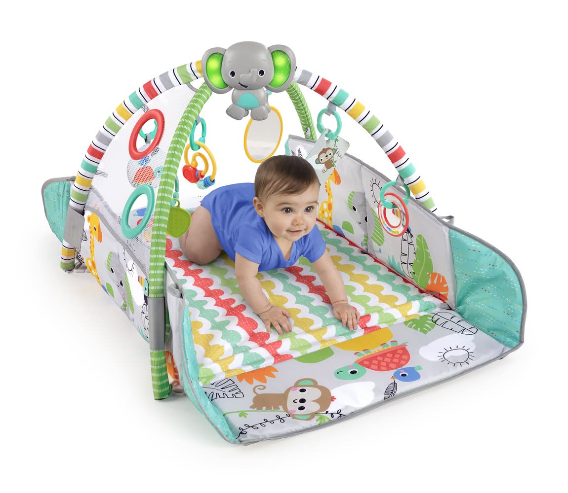 Bright Starts 5 in 1 Your Way Ball Play Baby Activity Gym & Ball Pit Totally Tropical includes an activity mat that offers a variety of fun activities and can also be used as a ball pit. It is designed to be safe for children and provides multiple ways to play.