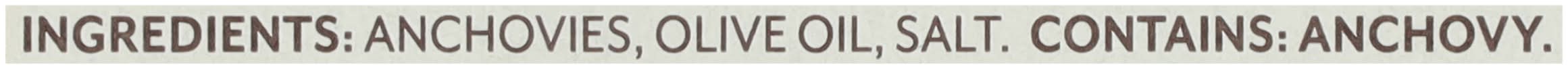 Wild Caught Anchovies, Olive Oil, Salt. Contains: None Additives: None